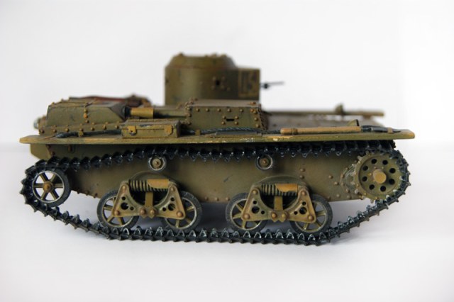 Благодарю за отзыв. Гусеницы покрасил в черный, нанес потертости до метала и запылил. Долго думал стоит делать грязь или нет, но решил остановиться на таком варианте.