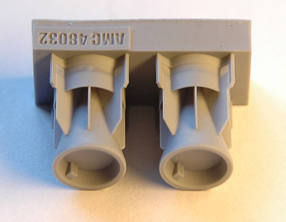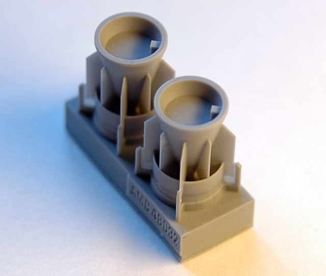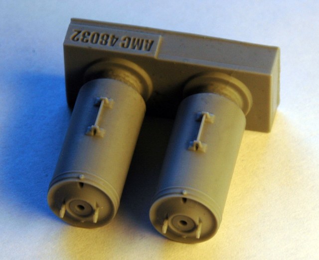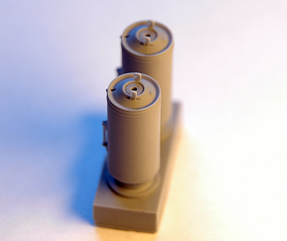 Бомба достаточно фактурная, с характерными крюками в передней части, к которым, при необходимости, притягивается обтекатель. Внешний вид и геометрические размеры не вызывают сомнений, промерялись реальные образцы на аэродроме и кафедре АСП. Толщина стабилизатора 0,15 мм, что даже немного меньше толщины стандартной фото-травленной пластины (0,16-0,17 мм). Для защиты стабилизаторов от повреждения при транспортировке они защищены вертикальными пилонами. Удаление пилонов не вызывает трудностей, толщина соединяющей перемычки около 0, 1 мм. Хорошо выполнены сварочные швы.