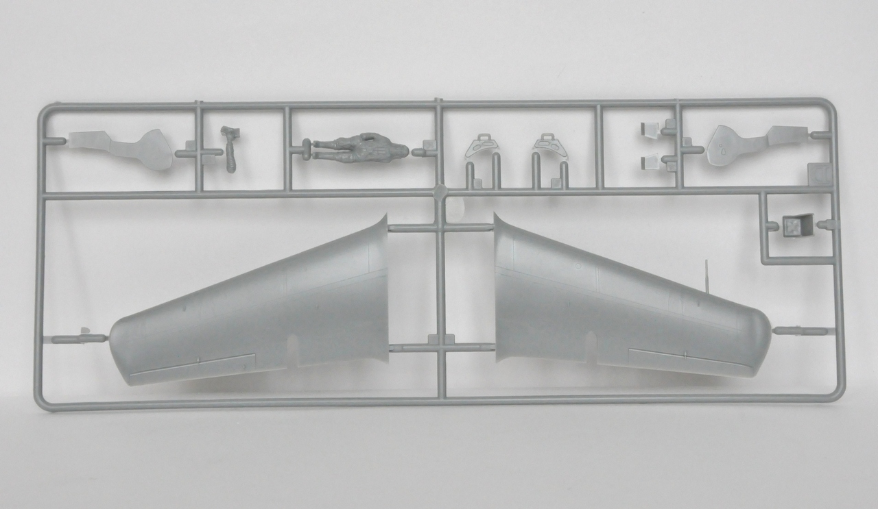 В набор входят: литники светло-серого цвета в количестве 5 штук и один литник остекленения из прозрачного пластика. Все литники упакованы в один прозрачный пакет. Литье качественное. Облоя и утяжин не наблюдается. Но, ВНИМАНИЕ!!!!!! Расшивка модели внешняя. Деталей не много. В наборе присутствует пилот.