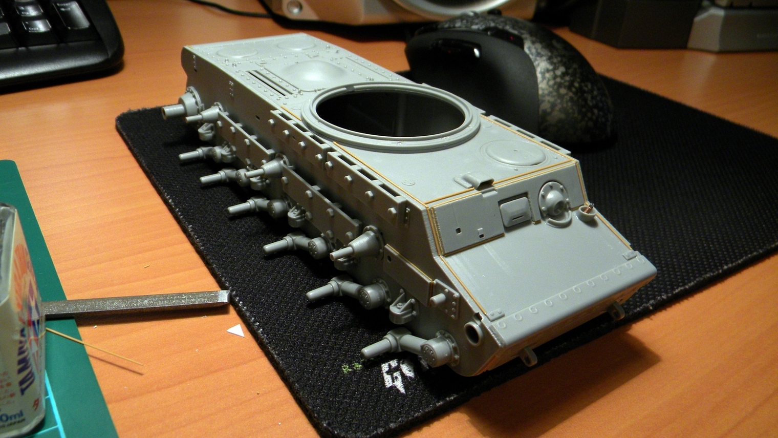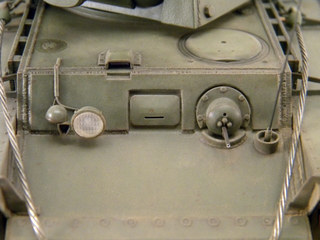 Окраска акрилами Tamiya: грунт, прешейдинг XF-1, база XF-65, высветления корпуса очень жидкой XF-2, XF-3. Гуси XF-1, затем XF-49. Беговые дорожки катков и гусей XF-16.