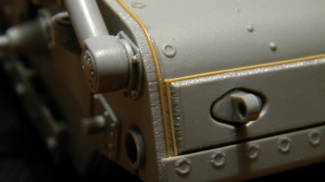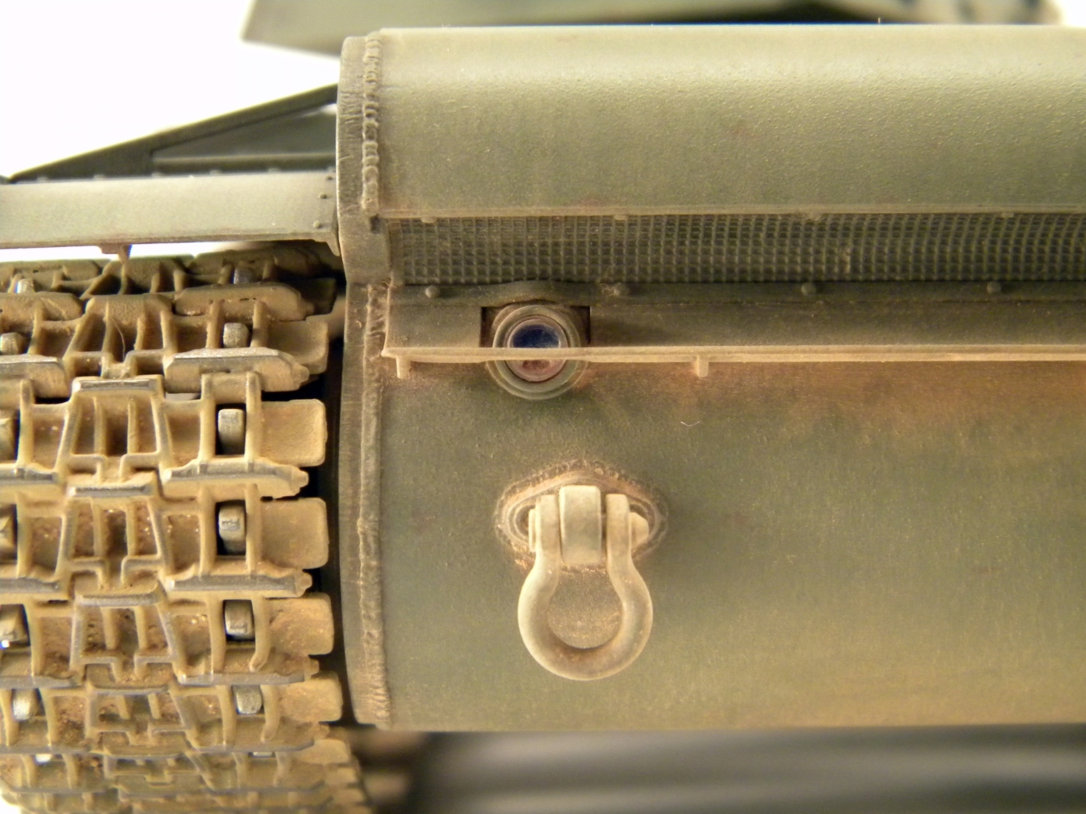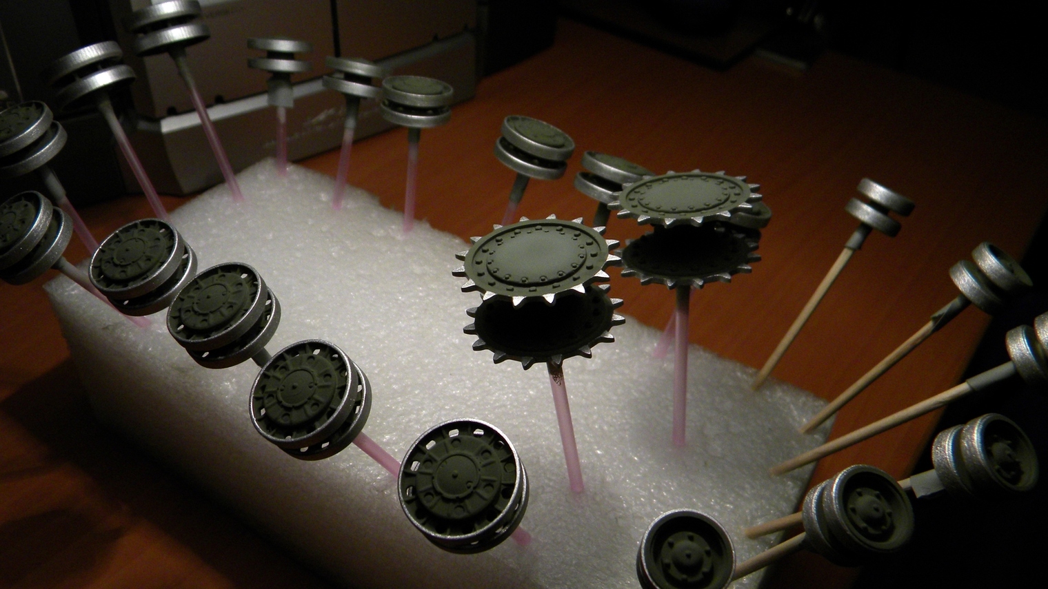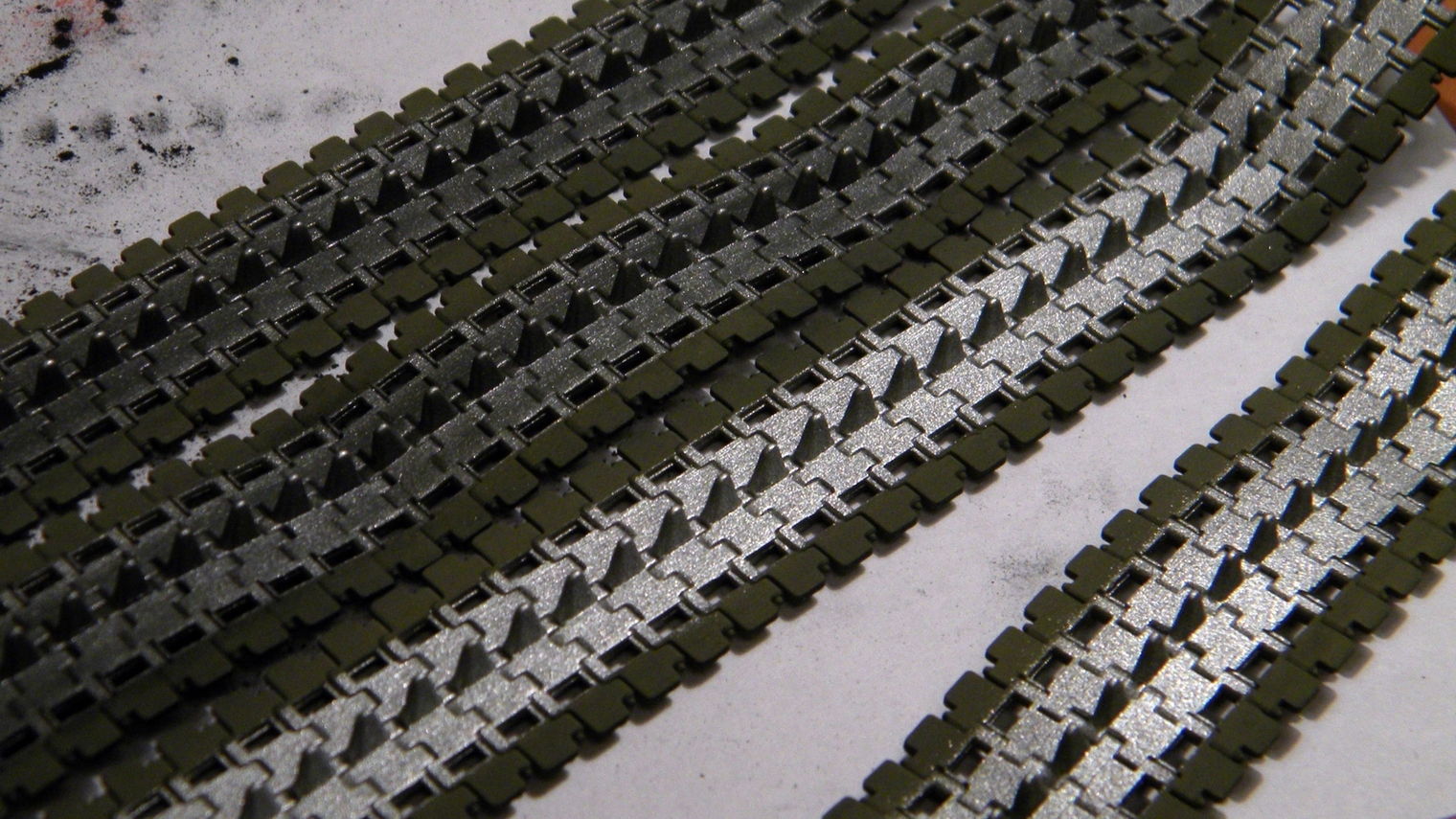 Беговые дорожки на гусях и катках самому не очень понравились. Без запыления пигментами они абсолютно не реалистично выглядят. В следующий раз буду делать всё по другому и без тамиевских акриловых металликов. Уж больно они крупнозернистые.