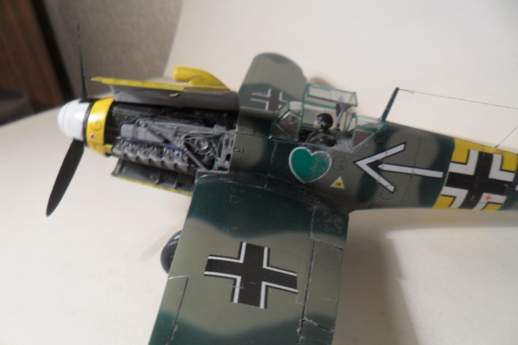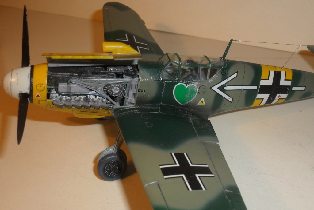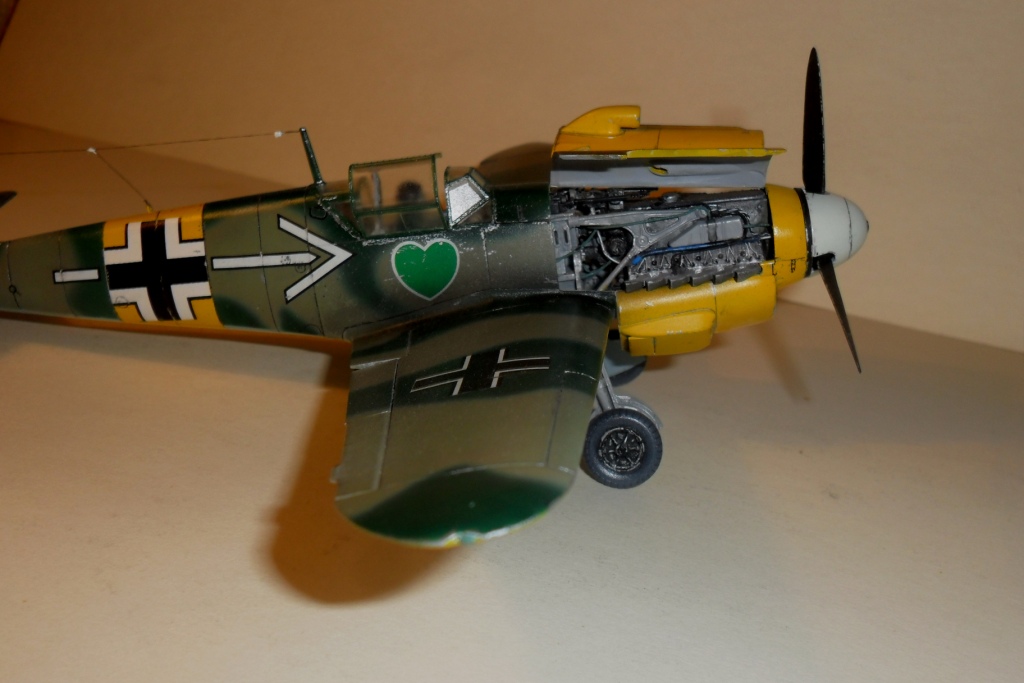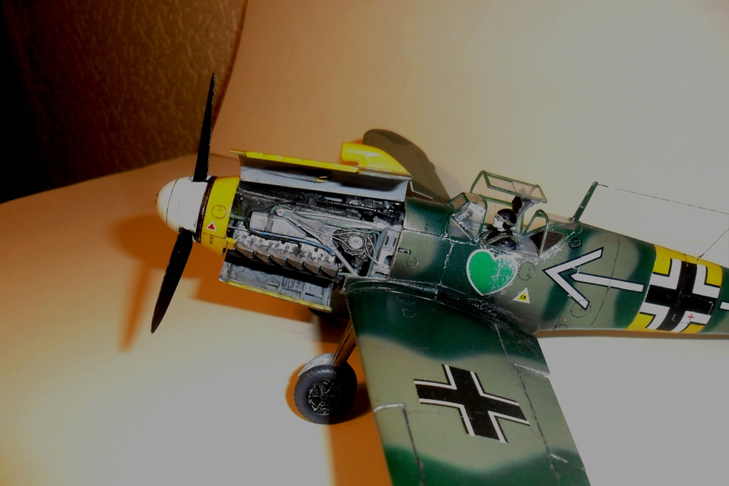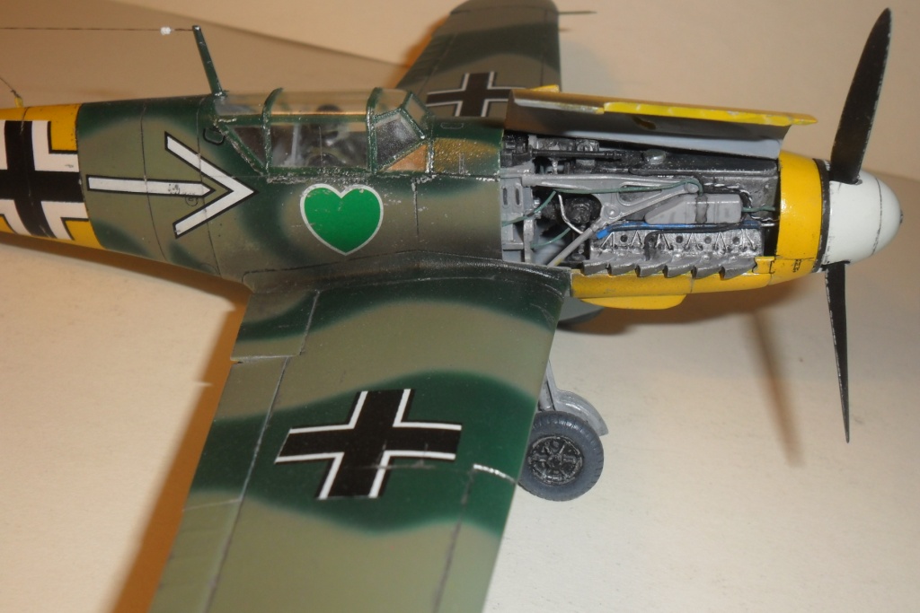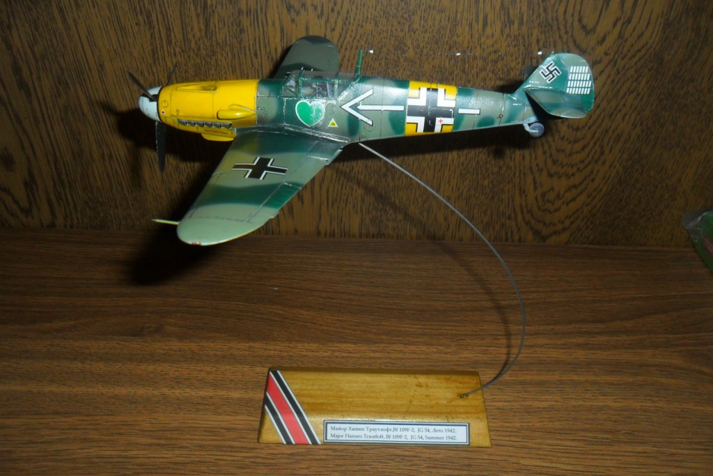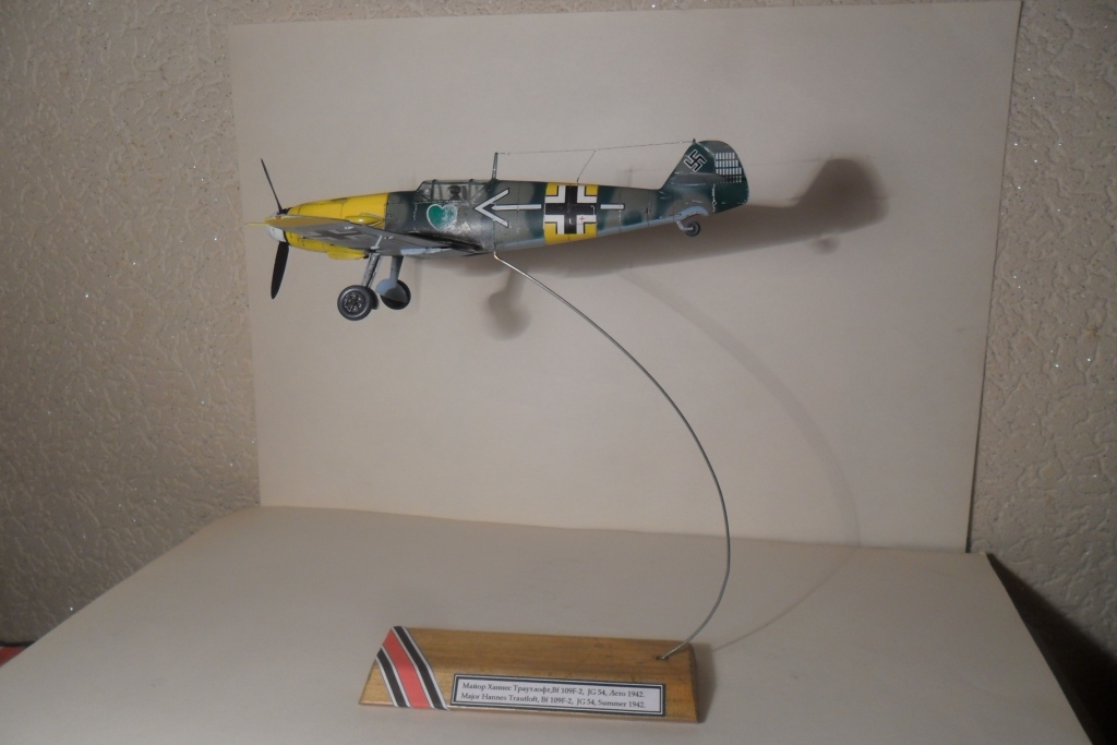 Мерси, обожаю комплименты. Мотор вроде как окрашен, сначала серебро, потом чёрный мат, но уж никак не голый модельный пластик. Верхние капоты, те что даны в наборе с расшивкой, погибли при вскрытии моторного отсека. Пришлось ставить гладкие, да и они не хотели закрываться, пришлось брать копирку и по её следам выбирать пластик. БАНО на машине Траутлофта были смещены к задней части законцовок крыла и, как следствие, обтеканию потоком не мешали, видимо поэтому и не были закрыты прозрачным колпаком. Кокпит, согласно той же Звезде цвета "шаровый". Тормозные не шланги, а трубки изготавливались из металла и провисания у них не могло быть в принципе. КАМО,по той же Звезде, тёмно зелёный и хаки. Понимаете, ХАКИ, но не коричневый. 30 мм пушки в развале двигателя появились только в 1943г., и то ставились они уже фронтовыми инженерами из комплекта №2, поставляемого на фронт, когда появились первые серийные советские истребители,выпущенные вновь отстроенными в эвакуации авиазаводами, способные конкурировать с Мессерами и появилась острая необходимость в увеличении огневой мощи. Так, что летом 1942 у Траутлофта пушки, точащей из кока винта могло и не быть. Лопасти пропеллера... Ну не знаю, Глядя на кадры хроники со сбитыми немецкими машинами и завитыми в дугу лопастями их пропеллеров, трудно верится что они из дерева... Стойки шасси RLM02.У того же Бориса Вырыпаева (BorisV) есть фотосессия музеев. Так вот у мессера из RAF Museum London в Хэндоне зеленью там и не пахнет. Ну и могу посоветовать док.фильм производства НТВ "Истребители люфтваффе. Восточный фронт."