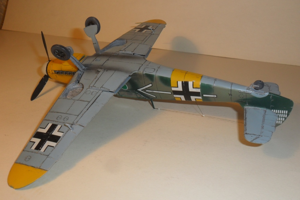 В целом покрашено у вас не везде аккуратно, это в частности мотор, ниши, диски шасси. Схема камуфляжа на машине Траутлофта была RLM78/79/80, то есть грубо говоря цвета сверху должны быть зеленый и светло коричневый, у вас коричневый немного не того оттенка. Далее, цвет RLM 02 какой то у вас бледный, пушка на коке винта никак уж не белая... Ну и лопасти... сколько раз уж на каропке обсуждали это... Лопасти не были черными! Они были RLM 70, тёмно-зелеными, да и не обдирались так лопасти... они ж деревянные, а у вас сколы до металла аж...