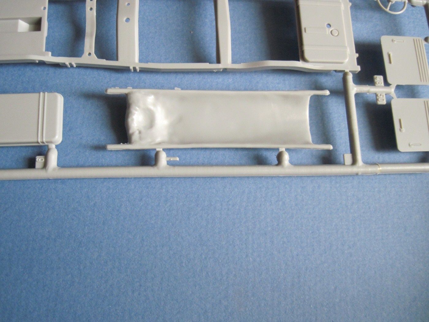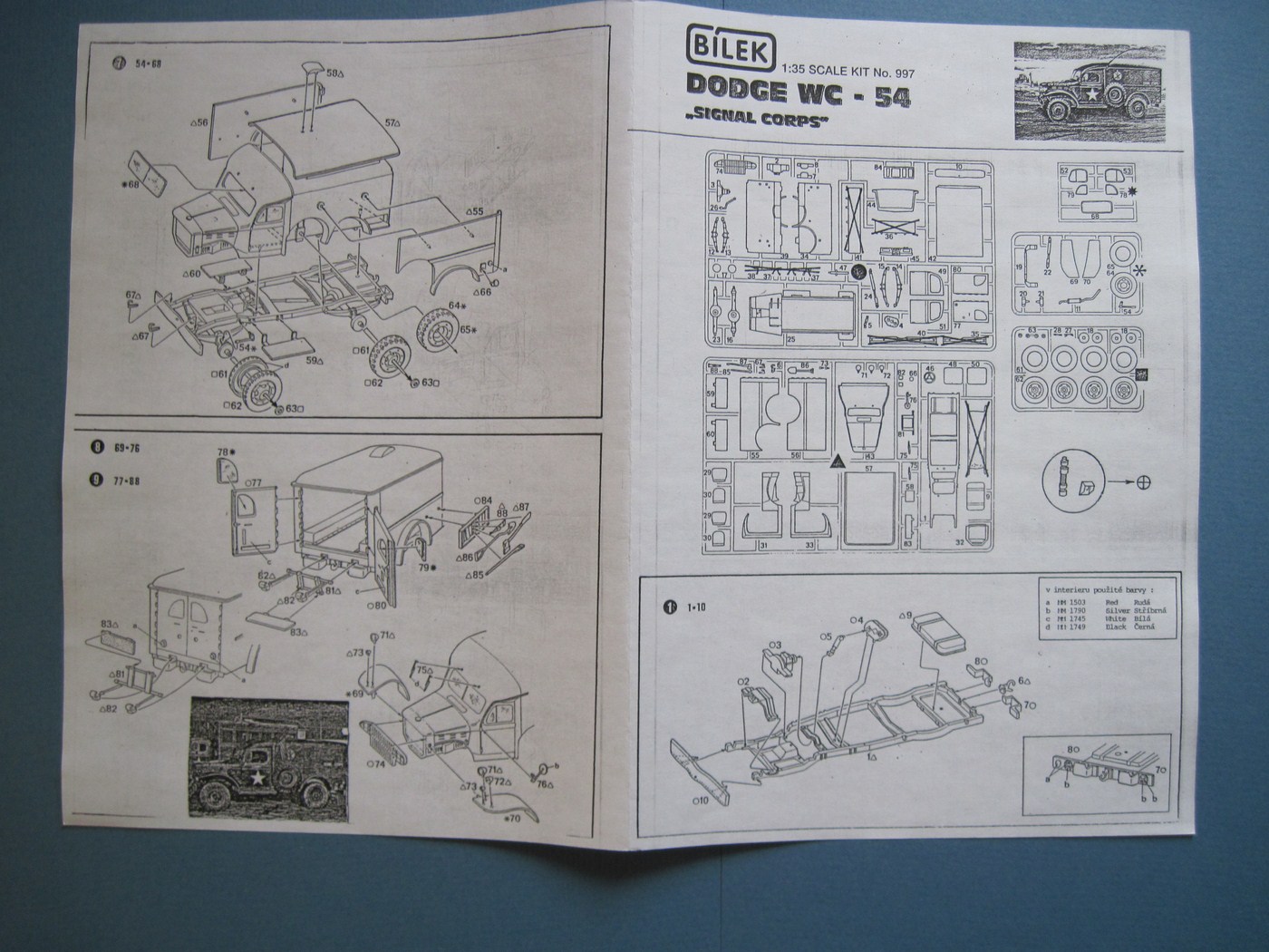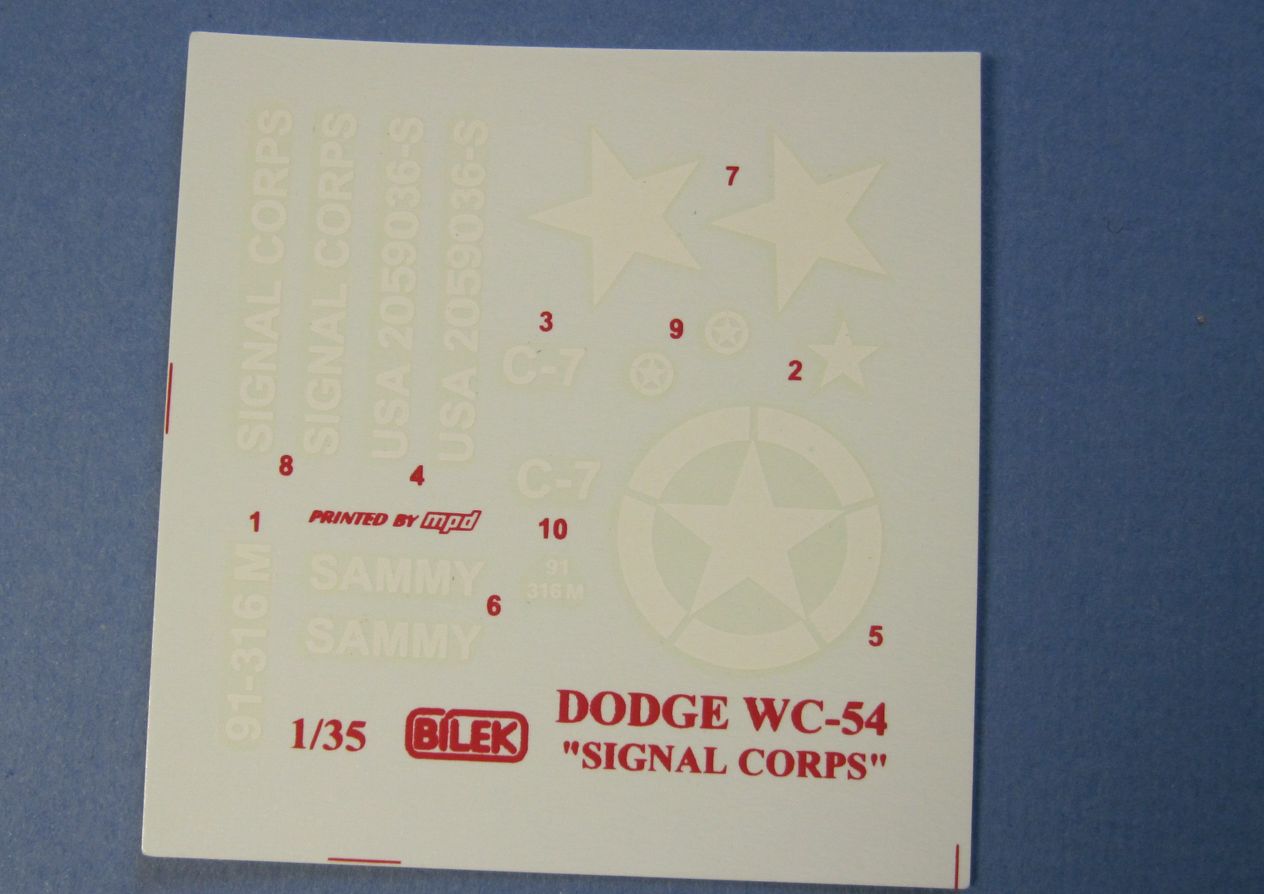 Сам набор находится внутри маленькой коробки из тонкого картона. Внутри 2 листика бумаги: поменьше - схема окраски(образец простоты), побольше - инструкция с шагами сборки и парой крошечных ужасных черно-белых картинок-фотографий. Комплект декалей signal corps(в других наборах от Билека есть вариант декалей для санитарной машины, если я верно понял). Далее - запечатанный пакет с литниками (4 штуки, отдельно упакован пятый, с деталями остекления) и пакетик со смоляными деталями. Да, чехи таки внесли изменения в комплект и щедро добавили две смоляные детали, которые оказались гнездом и стойкой для антенны, если верить инструкции. При осмотре нашел немного облоя, много толкателей, но вроде бы все попадают на внутренние поверхности. Моделисты, которые сталкивались с этим набором, нарекают его лютыми дровами и грозят длительными перепилом.