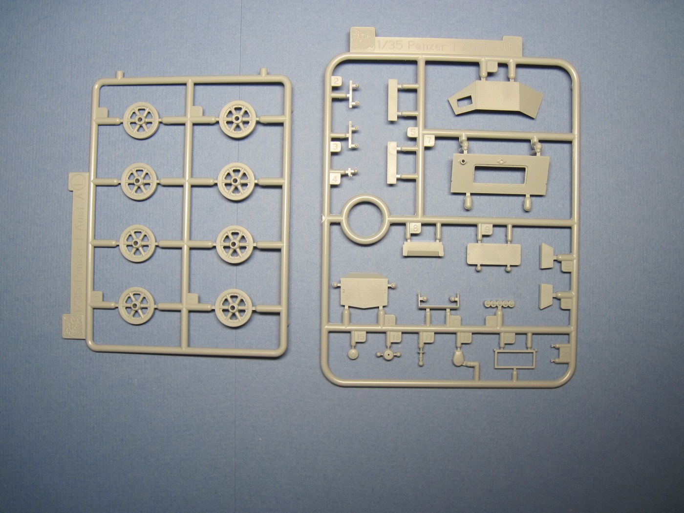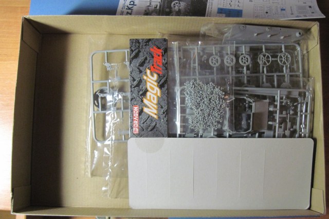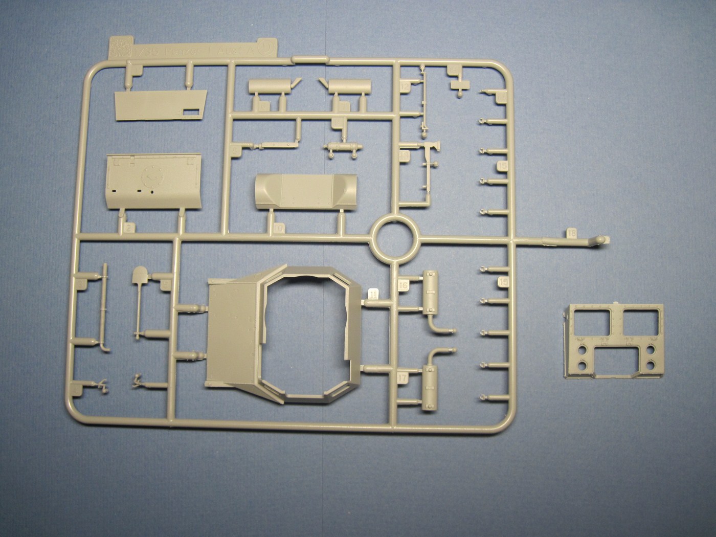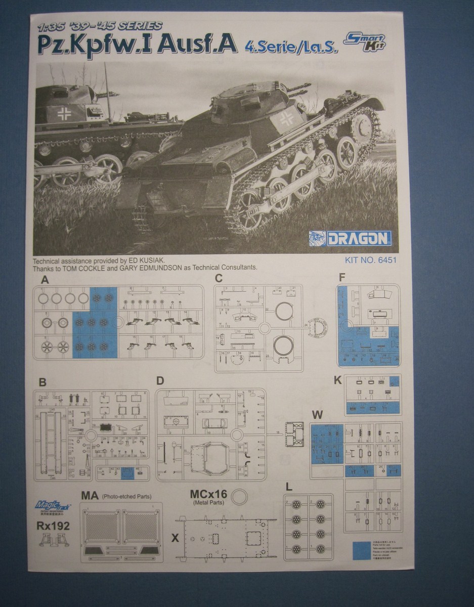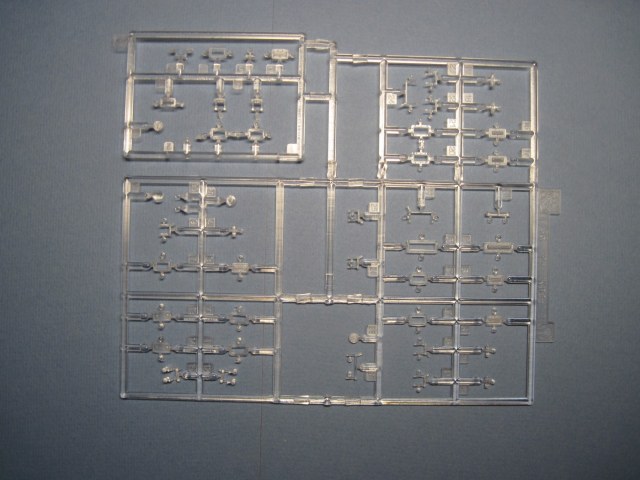 Никогда еще не видел так мало литников в коробке от Драгона. Весь набор мог бы комфортно уместиться в упаковке в два раза меньше по размеру. Всего в комплекте 6 литников, плюс большой литник с прозрачными деталями. На картонке с "дополнительными фичами": пакетик с горстью мэджик траков, пластинка с травлеными решетками, пакетик с травлеными ободами для катков и крошечный листик с декалями, ничего занимательного, просто три креста. При осмотре не нашел никакого литьевого брака, разве что толкатели на внутренней стороне крыльев, которые не должно быть видно. Единственные сомнения вызвали стволы пулеметов, возможно их стоит заменить на металл.