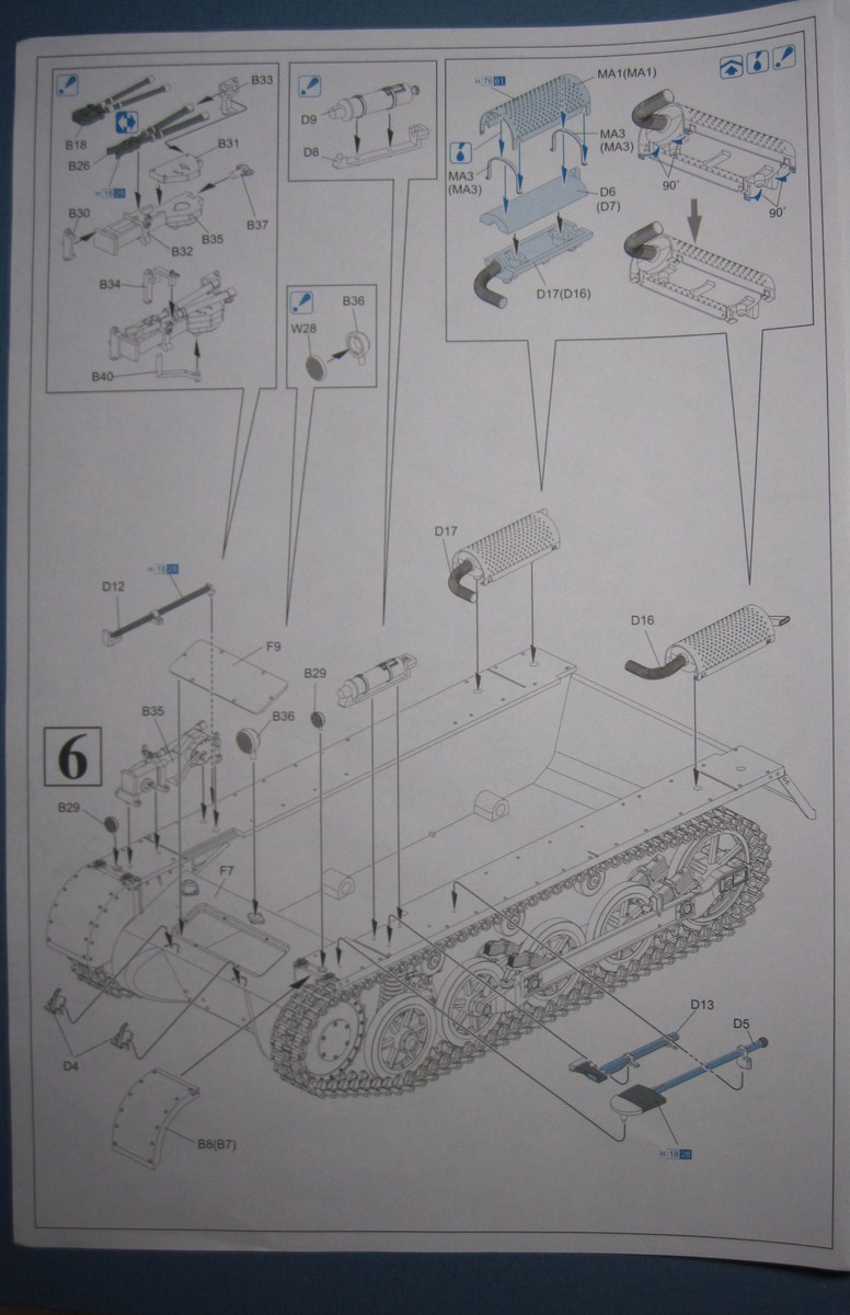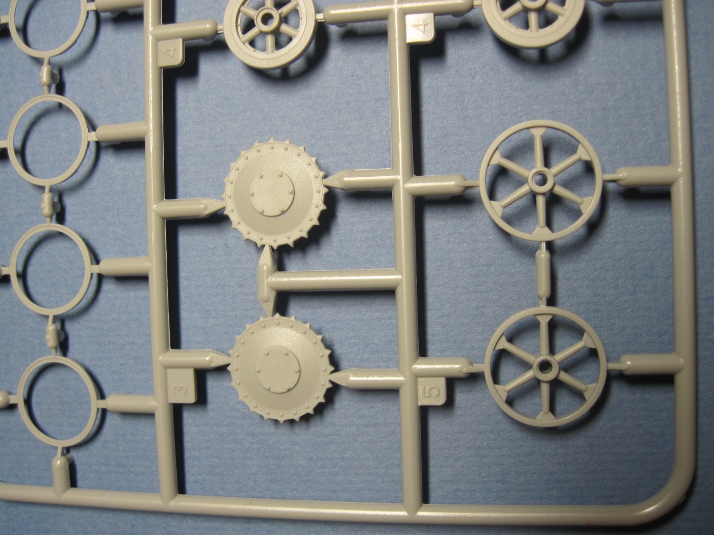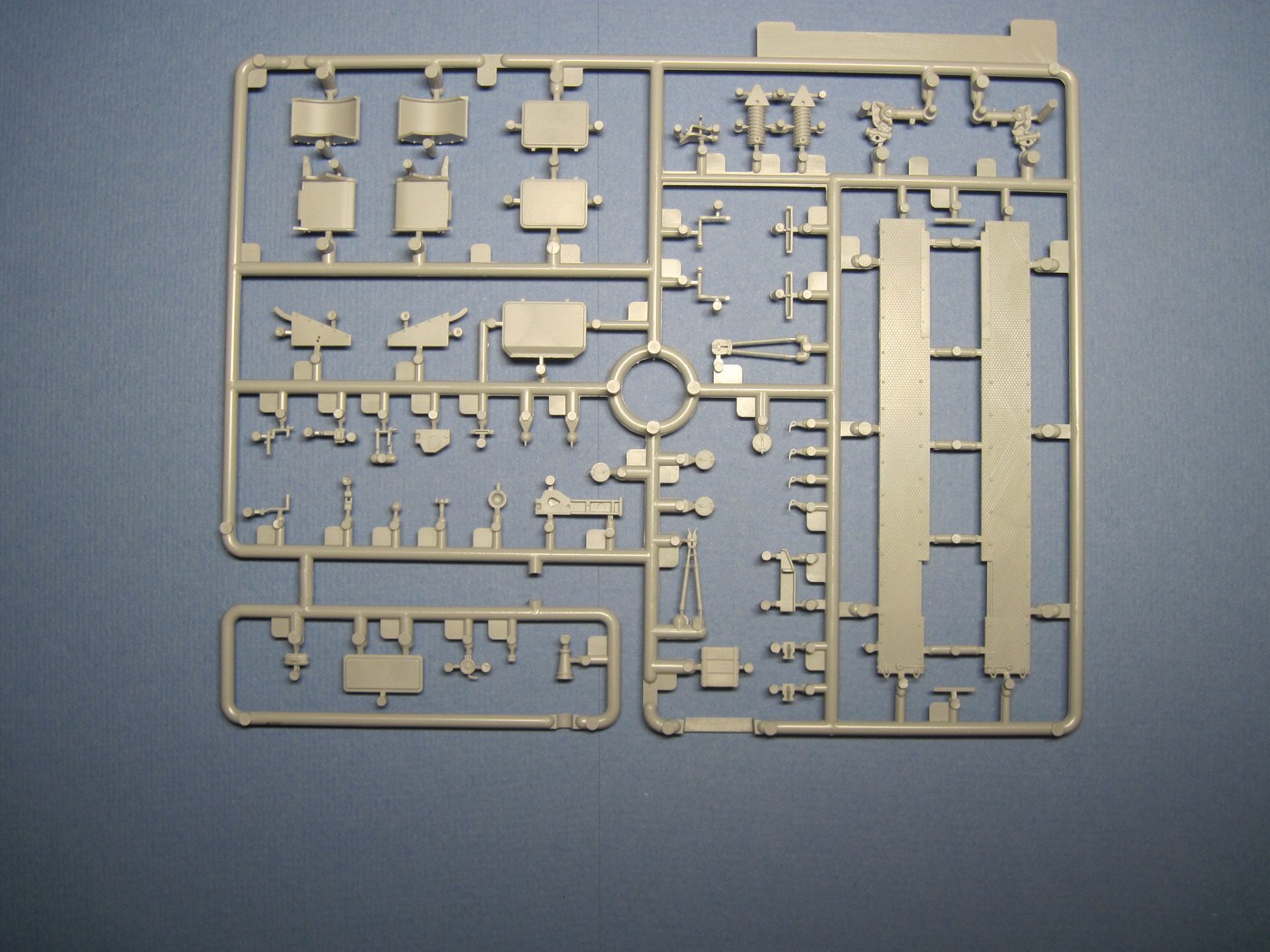 Никогда еще не видел так мало литников в коробке от Драгона. Весь набор мог бы комфортно уместиться в упаковке в два раза меньше по размеру. Всего в комплекте 6 литников, плюс большой литник с прозрачными деталями. На картонке с "дополнительными фичами": пакетик с горстью мэджик траков, пластинка с травлеными решетками, пакетик с травлеными ободами для катков и крошечный листик с декалями, ничего занимательного, просто три креста. При осмотре не нашел никакого литьевого брака, разве что толкатели на внутренней стороне крыльев, которые не должно быть видно. Единственные сомнения вызвали стволы пулеметов, возможно их стоит заменить на металл.