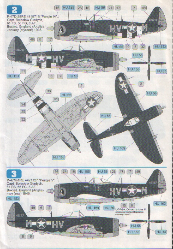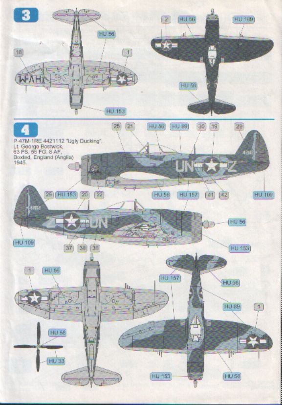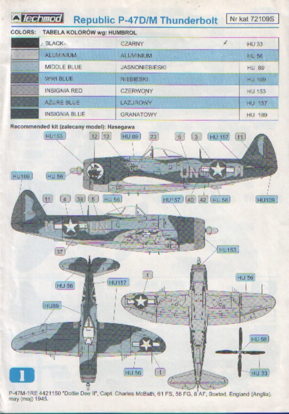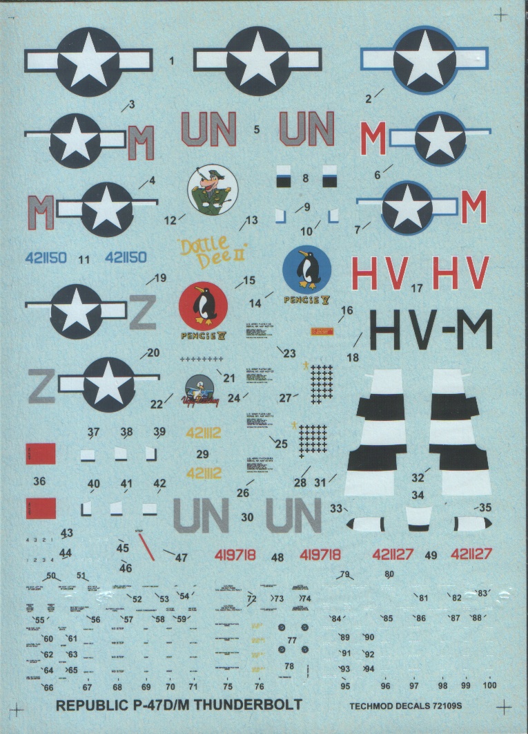Декаль будет интересна тем моделистам, кто не доверяет декалям Академа на предмет привариваемости, а также тем, кого не устраивает скупость содержания изкоробочных декалей, скажем, Хоббибосса. Декаль Техмода также позволит обладателям Ревелловского P-47D-30, имеющего форкиль, без проблем сделать P-47M, поскольку в коробке P-47D-30 лежит тот же самый пластик, который Ревелл раньше клал в коробку P-47M. Особо ценными элементами декали являются полосы вторжения, оставшиеся на нижней части фюзеляжа с августа 1944г. и имеющие именно у Тандерболта много сложных уступов и вырезов, а также буквы с окантовкой, особенно цвета металлик, которые невозможно напечатать на принтере, поскольку серебристого цвета в картридже просто нет. Р-47М в нестандартной сине-голубой или чёрной окраске 56-го полка украсит любой домашний авиамузей.