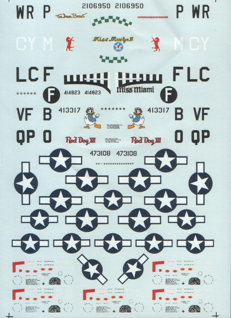 Декаль известнейшего американского производителя на столь же известный самолёт отличается тем, что не только обозначения конкретных бортов, но и все ОЗ и вся техничка даны в пяти комплектах, что даже для афтермаркет-декалей большая редкость. Декаль будет интересна прежде всего тем любителям американской авиации, которых не устраивают очень скучные изкоробочные окраски, предлагаемые, в частности, нашим "Моделистом" и китайским "Хобби-Боссом". Декаль можно приобрести в соответствующей теме автора в разделе БАРАХОЛОВКА за 170 рублей.