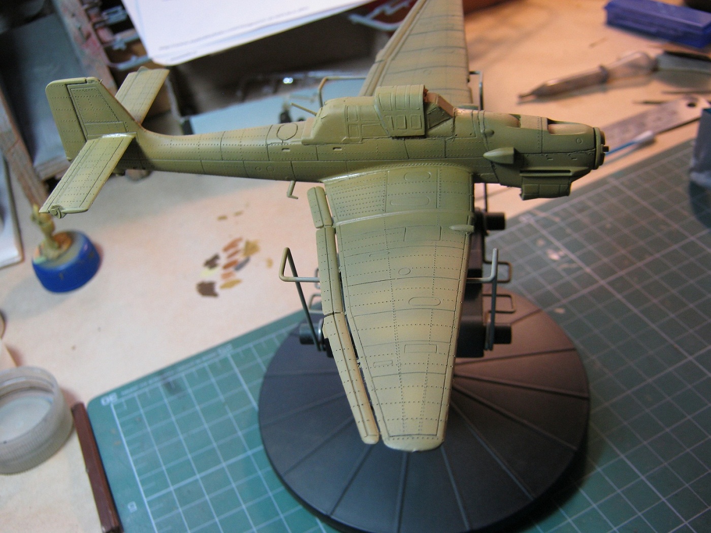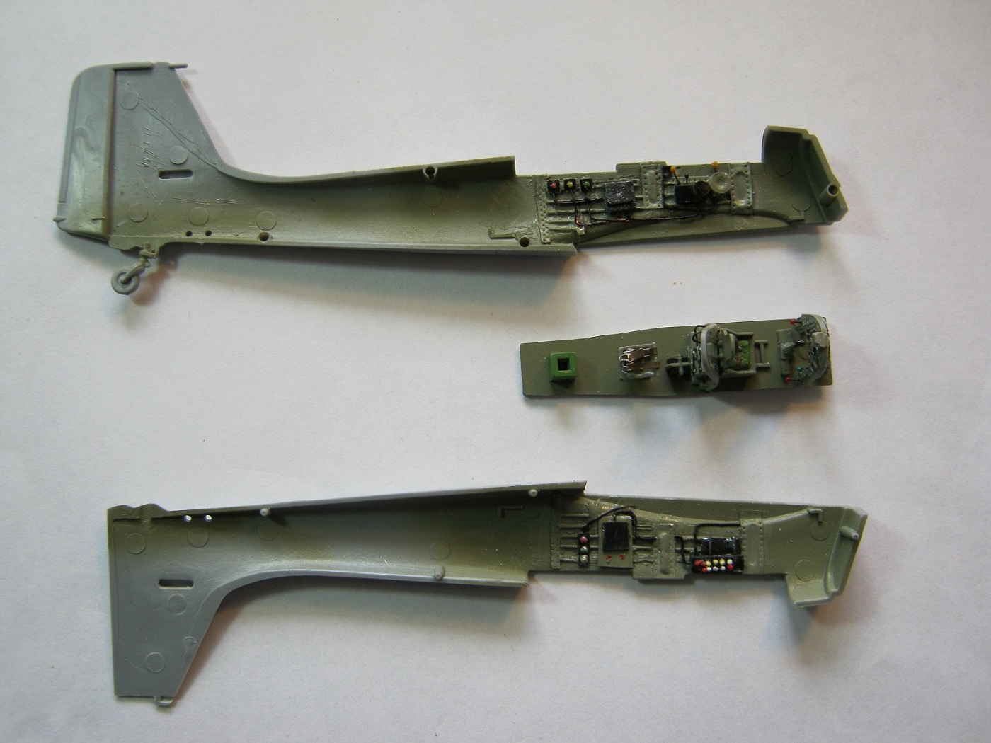 Автора прошу не обижаться, но перед тем как клеить про шпаклевку думайте в самый последний момент! Подгоняйте детали на сухую. А то скрываете шпаклевкой грехи склейки, потом упорно шкурите и режете расшивку (криво) что портит все картину. А некоторые швы попросту забываете закрыть, как на обтекателях шасси.