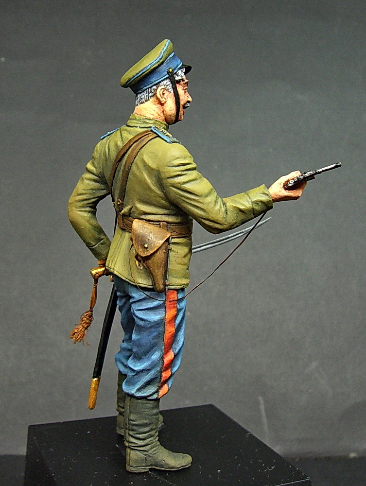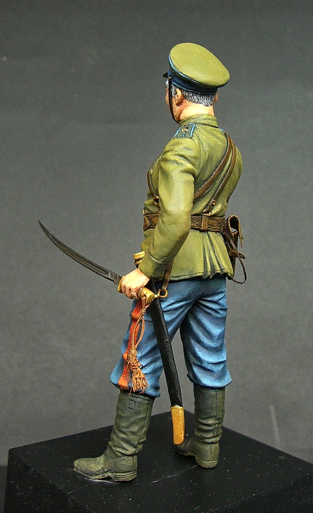 В моих " закромах " имелась старенькая фигурка " Русского кавалериста " , производитель " АРСЕНАЛ " . Взяв её за основу , провёл небольшую конверсию - вылепил новые кисти рук вставив в них самодельное оружие - НАГАН и ШАШКУ. Наган полностью вырезал из листового полистирола , а шашку выточил из простого гвоздя.Так как наган находится в руке, кабуру пришлось сделать пустой с отстёгнутым хлястиком. Немного поигрался с лицом фигурки пытаясь сделать похожим на моего напарника - с портретным сходством у меня всегда проблема была , но вроде получилось. И конечно же заменил звание с капитана на майорское - звание моего напарника.