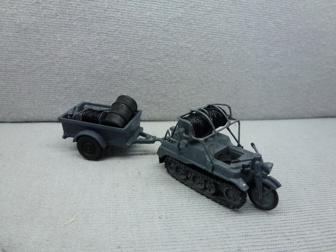 Взят моделистовский кеттенкрад.....добавлена рама для кабеля....изготовлены катушки....штатный прицеп не делал специально....зачем лепить с нуля если есть хеллеровкий 250кг грузоподъемности, взятый трофеем у Дюнкерка....в прицепе бочка, канистры и ящик не крашеный(ярковато, но сосновые доски так выглядят), поскольку прицеп нештатный - сцепное такое же....Немного долговато муторно....но все снимается, кабель вытягивается....В конце на фото процесс укладки кабеля(прижат так как нить упругая и физику никто не отменял),фото с обыкновенным кеттеном и БМВ Р-12(досайтовые работы), фото прототипа....Вроде бы ерунда...но пару недель искал "кабель"....нить обыкн. - при макро дает ворс....черная леска слишком упругая....а вот капроновая нить по моему похожа....На концах кабеля калабашки - кабель зачекован(жестяная банка со специалной смазкой чтобы кабель не насосал воды из воздуха....бумажная изоляция гигроскопична)....