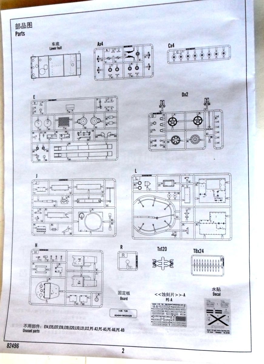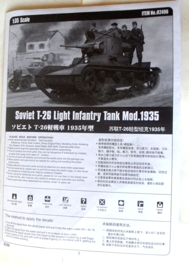 Модель упакована в плотную коробку, красочно оформленную в стиле данной компании. Внутри коробки находятся: ванна корпуса, 14 литников самого танка, один прозрачный литник со светоотражателем фары, 24 литника с траковыми пальцами и пакетик с рассыпными траками, инструкция в виде книжицы на 6 листах формата А4 в черно-белом изображении, цветной боковичок с образцами окраски машин, одна платка травления и декаль с опознавательными знаками на Гражданскую войну в Испании.