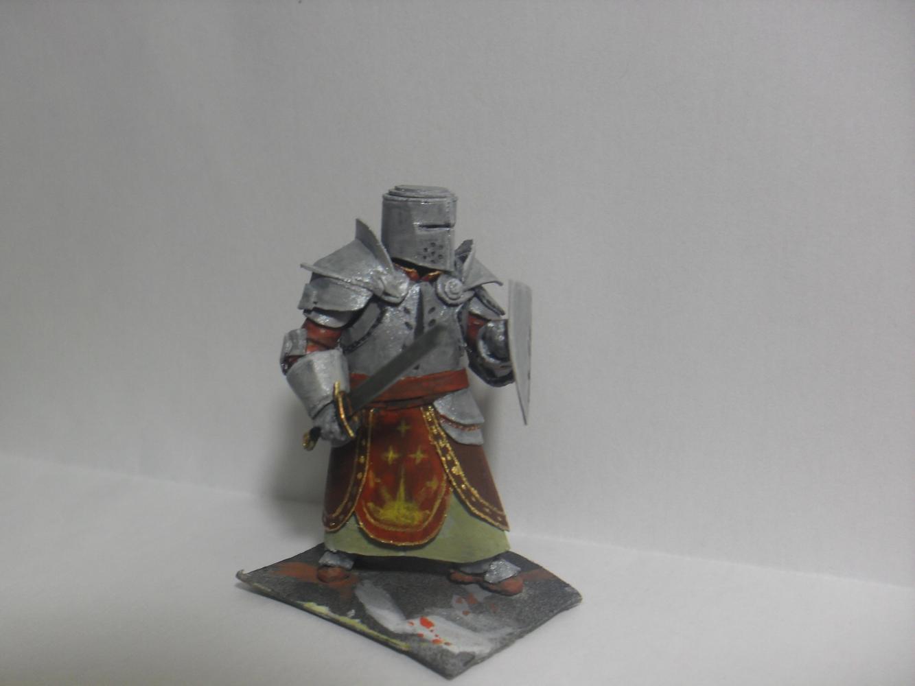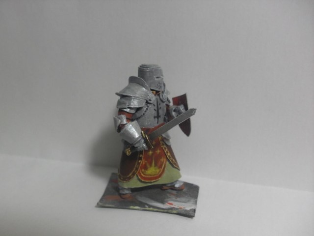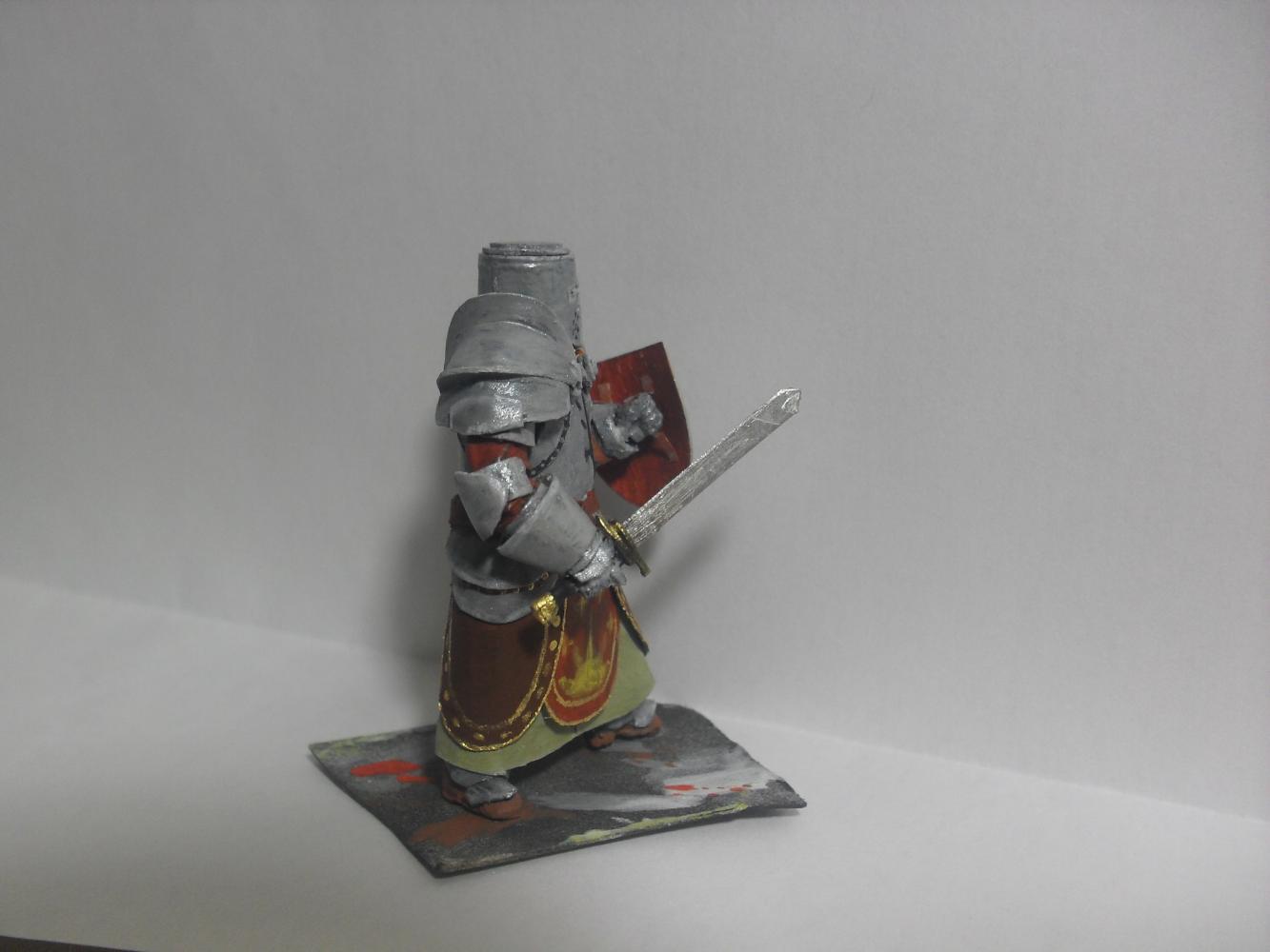 Делал как вам уже известно по стандарту. Частями (как настоящие латы) одевал кусочки картона на миниатюру (старая, вся поломанная, от звезды какой то русской пехоты.). Мечь из жестянки (консерва из под сгущёнки :)).