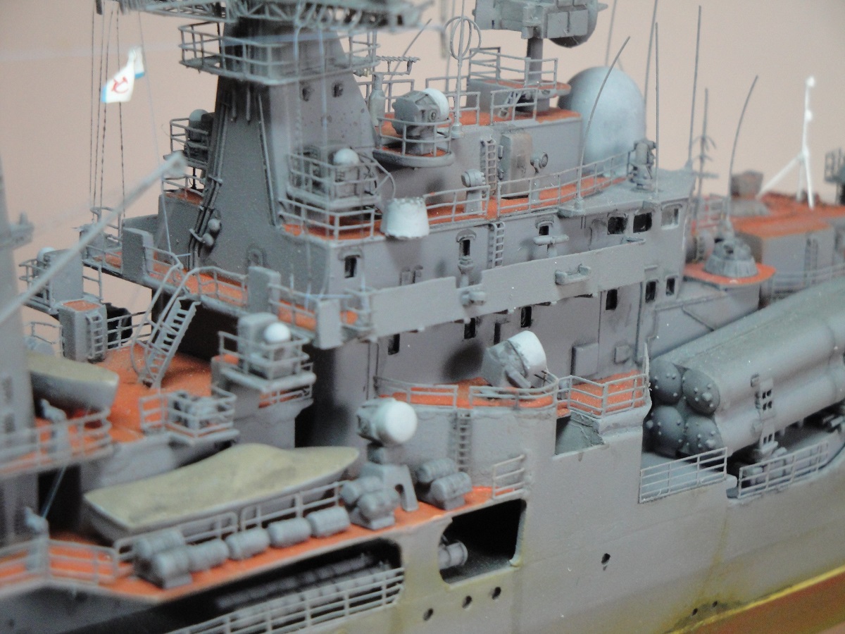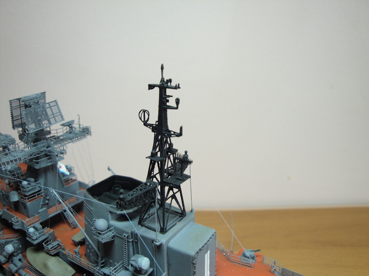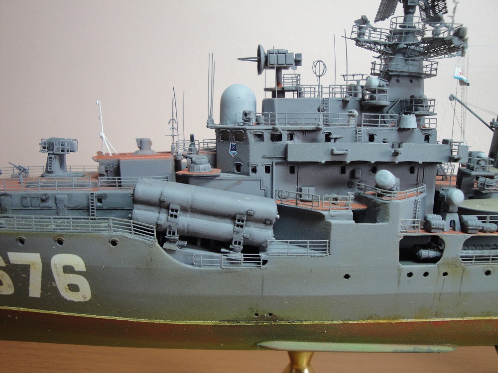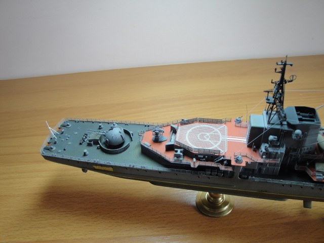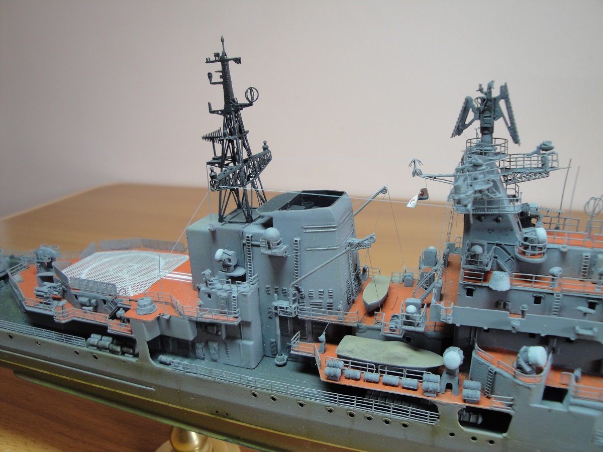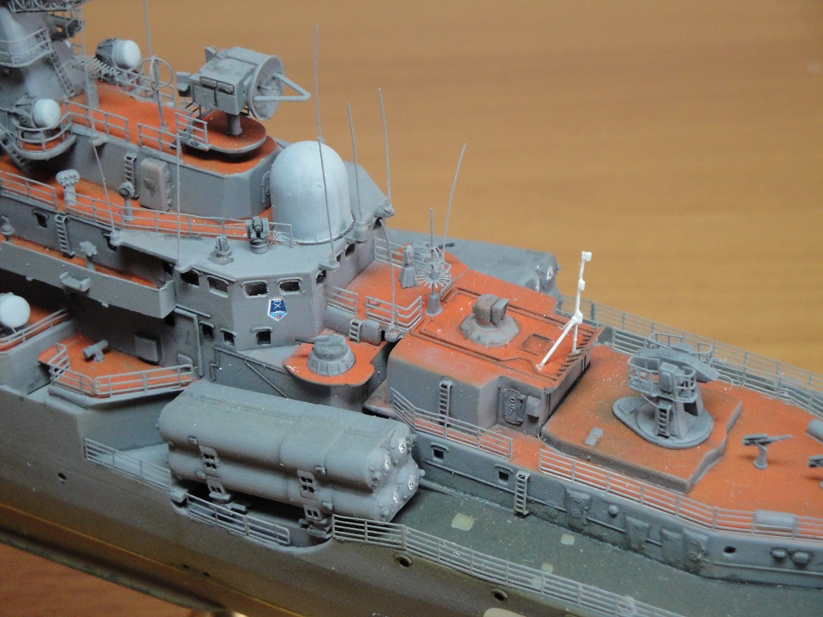 Ну начнем.Первое,что бросается в глаза-гигантский размер бортовых номеров.Второе-"лохматые"окна ходовой рубки.Штыревые антенны-бревнообразные.Нигде на стенках не показан комингс и в то же время в некоторых местах по стенке лезут рыжие разводы.Вертолетная площадка сделана хорошо,только разве она не зеленая?А сетка слишком белая.А вот откидное ограждение как раз должно быть белым.Флаг-фалы никакой необходимости красить не было.Поставить их после окраски.