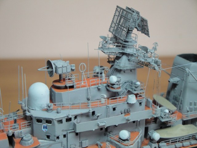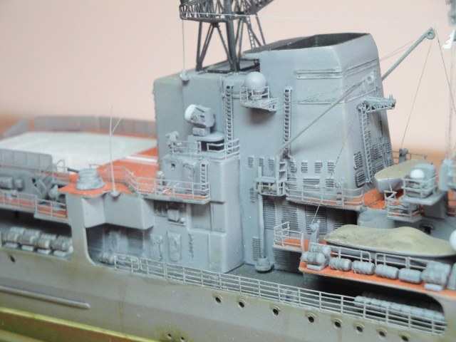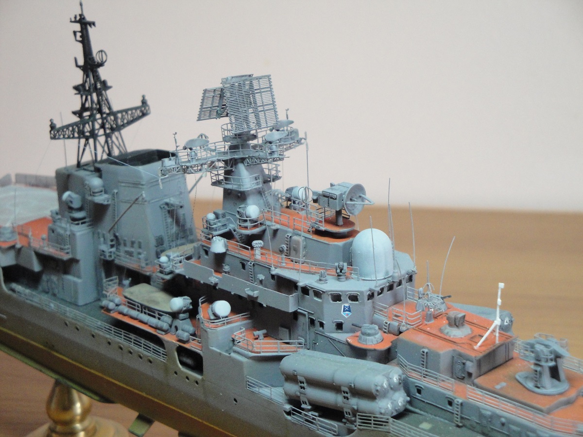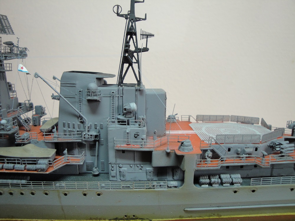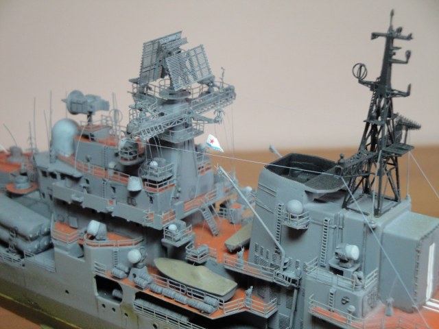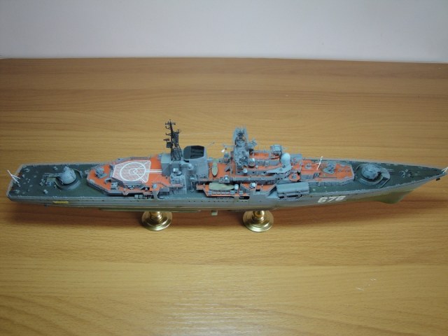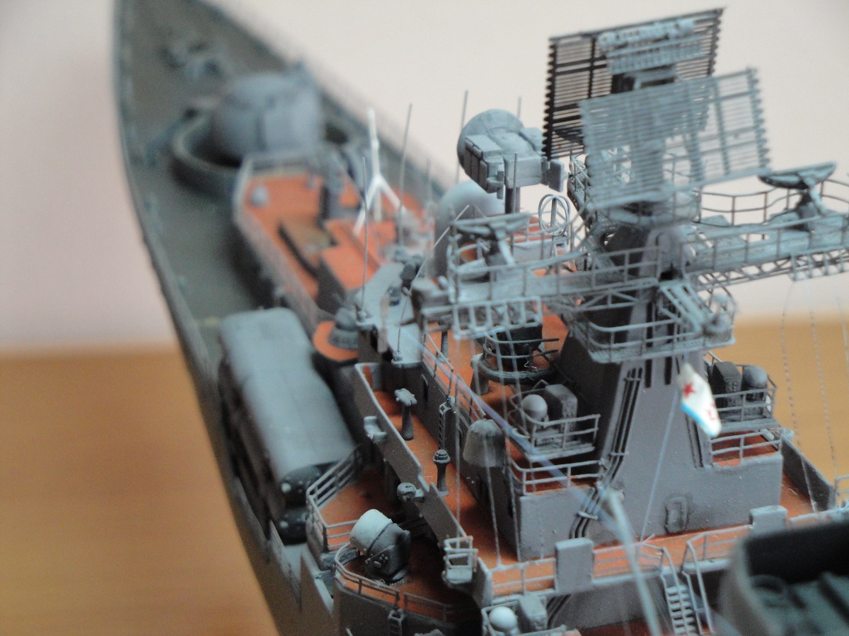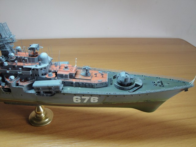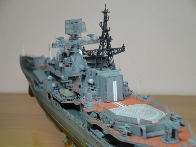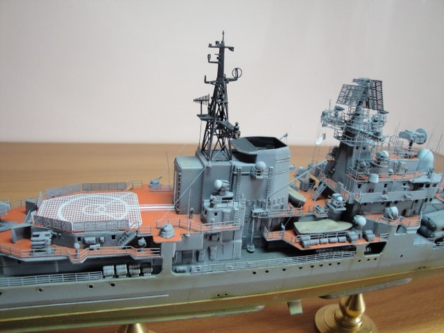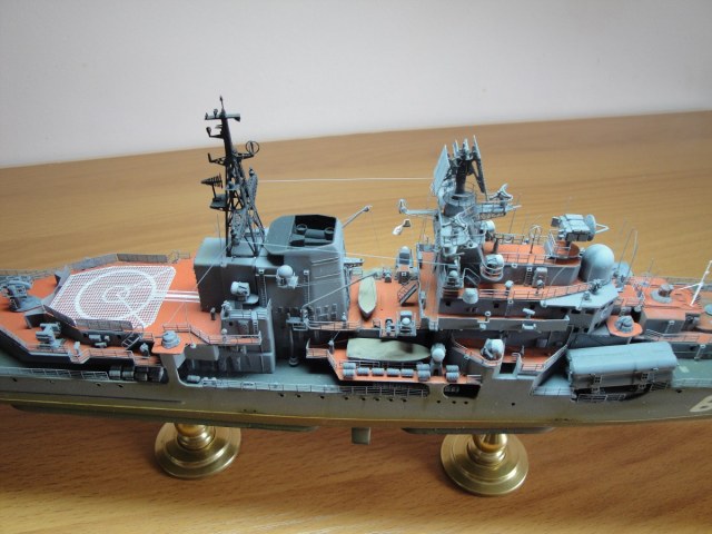 Ну начнем.Первое,что бросается в глаза-гигантский размер бортовых номеров.Второе-"лохматые"окна ходовой рубки.Штыревые антенны-бревнообразные.Нигде на стенках не показан комингс и в то же время в некоторых местах по стенке лезут рыжие разводы.Вертолетная площадка сделана хорошо,только разве она не зеленая?А сетка слишком белая.А вот откидное ограждение как раз должно быть белым.Флаг-фалы никакой необходимости красить не было.Поставить их после окраски.