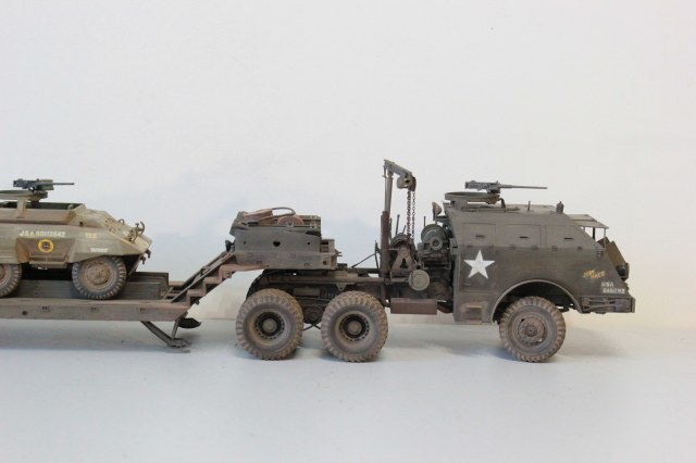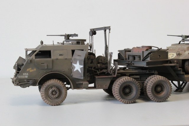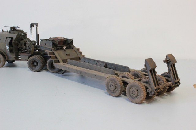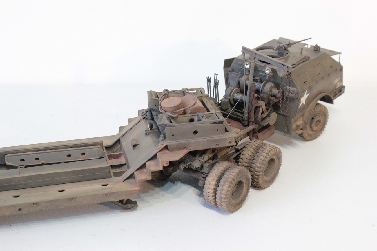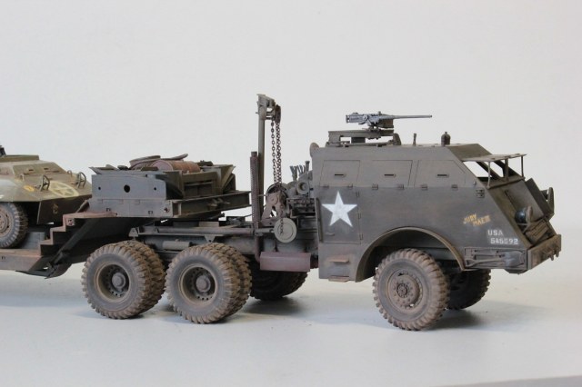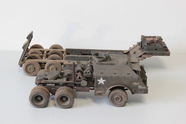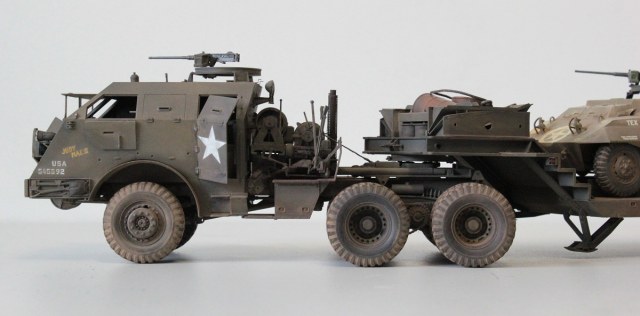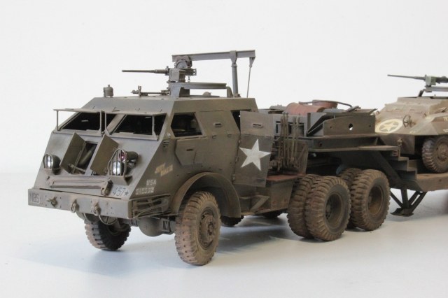 Модель «DRAGON WAGON U.S. 40 TON TANK TRANSPORTER» отфирмыТамия. Прототип модели – американский седельный тягач М25 (компания "Pacific") с полуприцепом-тяжеловозом М15 производства фирмы "Fruehauf". Автопоезд имел полную массу 93 тонны при длине в 19 метров и грузоподъёмности в 40 тонн. Отдельно без «телеги» тягач М25 мог использоваться в варианте 22-тонного бронированного эвакуатора и получал собственный индекс М26. Подробнее об истории этой замечательной машины можно прочитать в моей предшествующей работе «М26 ArmoredTankRecoveryVehicle».