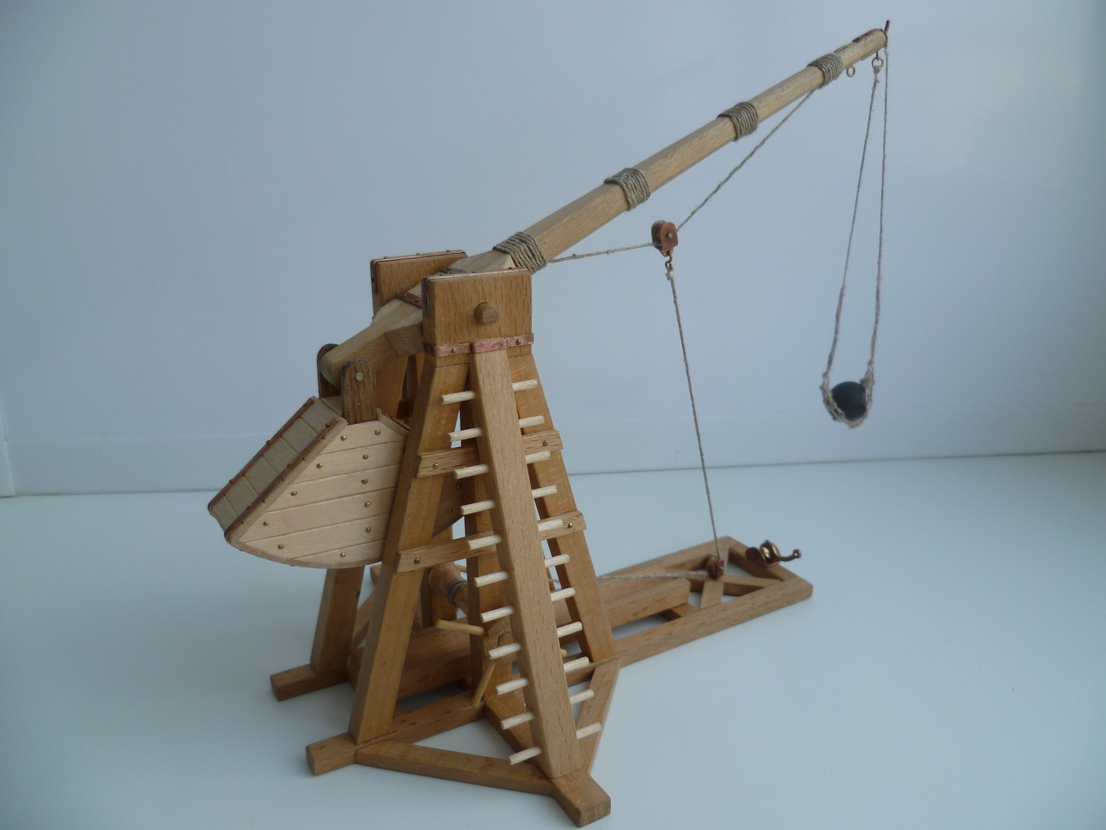 В конструкцию внес небольшие изменения: нижняя часть противовеса была сделана полукруглой, так как прямоугольный когда падает раскачивается и задевает краями за ворот натяжения. Сделал спусковой механихм, ролики, лестницу, добавил меди и гвоздей, сделал пращу из лняной нити. Корзину противовеса загрузил свинцовой дробью №5 ф3мм.