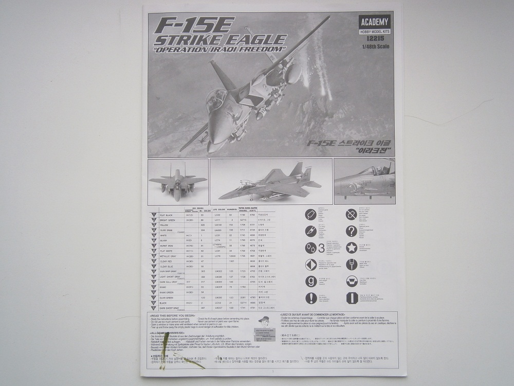 Приветствую Всех и доброго времени суток уважаемые коллеги по цеху !!! Предлагаю Вашему вниманию обзор Американского многофункционального истребителя F-15 E Strike Eagle от Корейского производителя ACADEMY представленную в 1/48-м масштабе. В красочной картонной каробке находится десять литников с деталями светло-серого цвета ,и один литник из прозрачного пластика это остекление фонаря кабины пилотов. Все детали упакованы в полиэтиленовые пакеты . Инструкция по сборке данной модели хорошего качества ,читается доступно ,все понятно !!! Также приложена инструкция по нанесению декали и предложено пять вариантов исполнения данного борта ,и также приведена по нанесению фототравления, в наборе оно тоже представлено по минимуму . Декаль в наборе отличного качества от фирмы CARTOGRAF представлена также на пять вариантов самолета. Теперь вернемся к деталям набора !!! Если четно открыв данный набор и при осмотре содержимого в каробке, то был доволен Детали хорошего качества, имеют хороший тоненький крой, но кое где придется пройтись СКРАЙБЕРОМ по расшивке. Детализация кабины пилотов выполнена в достойном исполнении, можно оставить и ее, но для гурманов !!! можно применить и от AIRES. Ниши шасси конечно желают быть лучше !!! очень слабоваты, колеса шасси нормальной деталировки ,можно оставить. В наборе представлен довольно богатый выбор вооружения, также хорошего качества. Сопла двигателей даны в двух вариантах тоже не плохого качества , но лучше заменить от AIRES они гораздо реальнее. Думаю разорится и приобрести их . С остекления фонаря кабины надо будет удалить шов по середине , и отполировать. Ну вот вроде и все что хотел отметить по данному набору,если что есть у кого дополнить или отметить с радостью приму все предложения . С уважением Дмитрий !!! Удачи Всем !!!