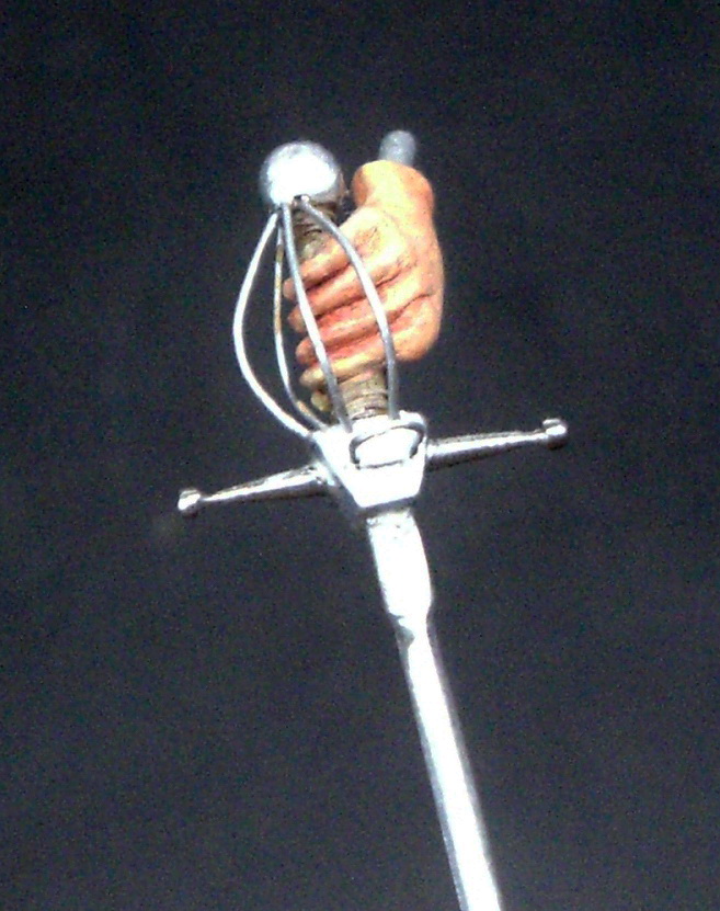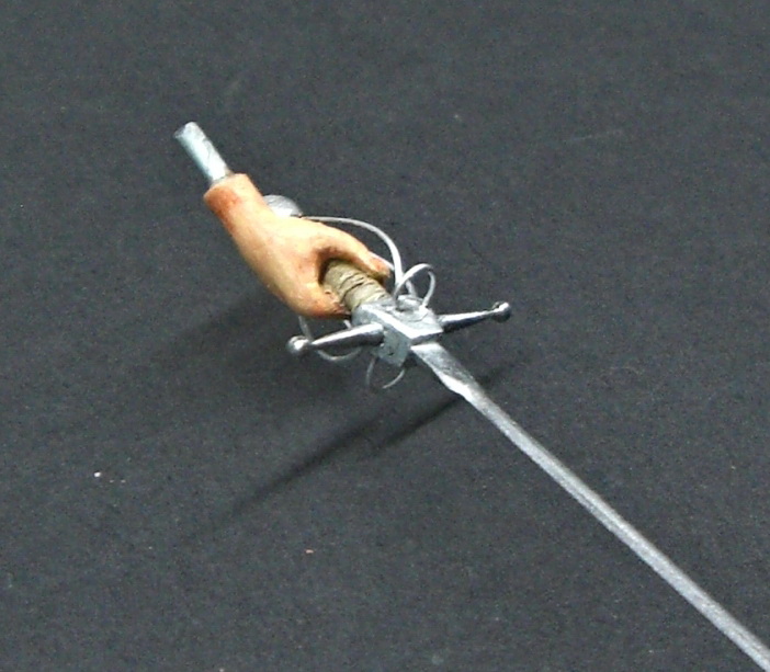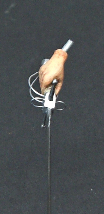 Из Тамиевской двухкомпанентной шпатлёвки я вылепил кисть руки пиратки поверх рукоятки шпаги , затем из тонкой проволоки сделал ЭФУС шпаги.