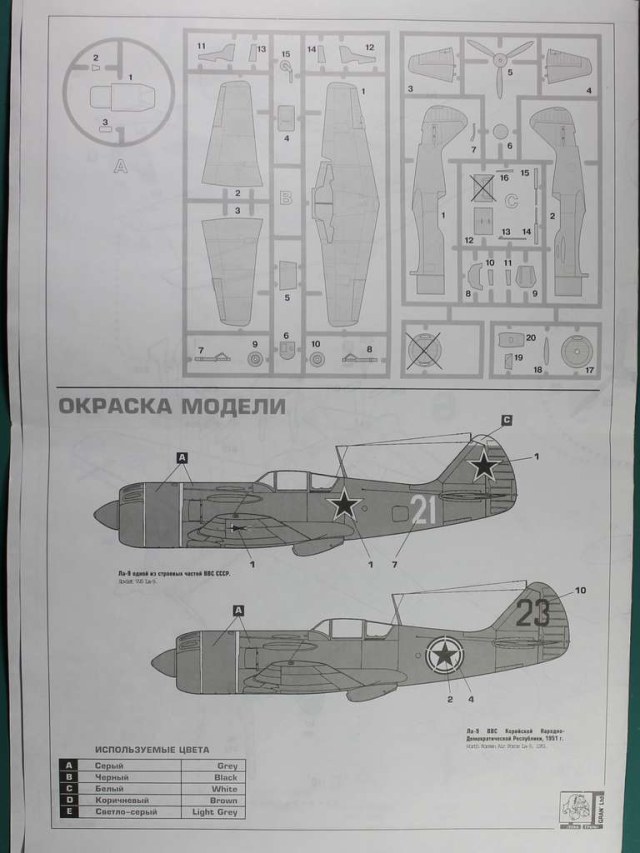 Модель истребителя Ла-9, пластик жесткий очень светлый, почти белый, облой в достаточном количестве, расшивка тонкая, внешняя, за исключением поверхностей управления, фонарь толстый и достаточно прозрачный. декаль на три национальных варианта: советский, корейский и китайский и несколько номеров, в инструкции указано только два варианта оформления, к сожалению в моем наборе отсутствует воздушный винт.