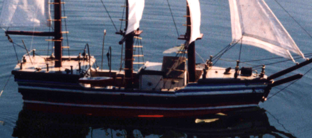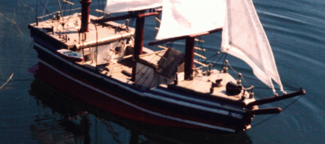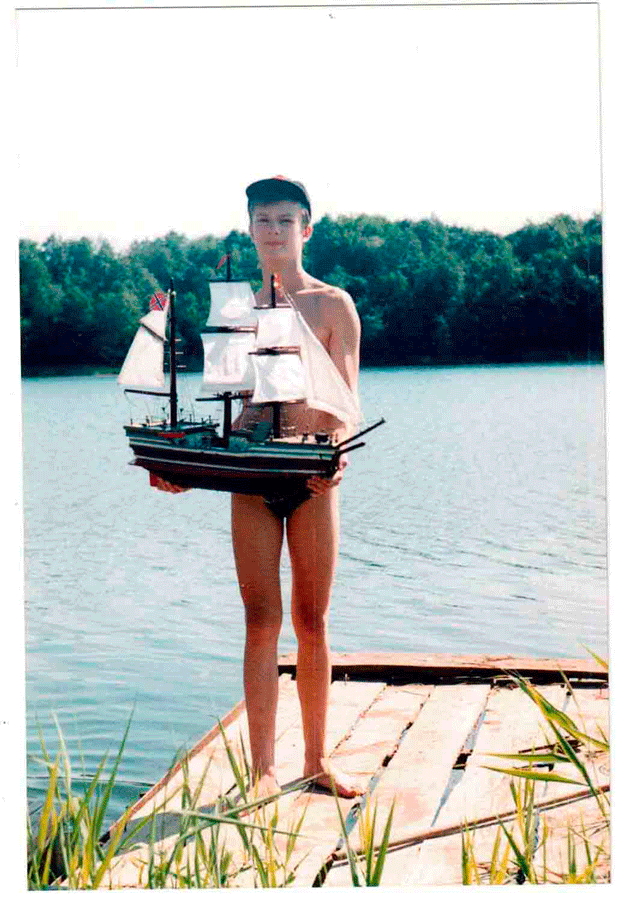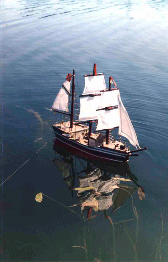 Разрешите представить вам свою первую модель. Должен сразу сказать, что делал её я не один, во всем мне помогал (а скорее это я помогал ему) мой дедушка, за что ему искреннее спасибо! Всё началось с того, что под впечатлением книг Жюля Верна и Станюковича я решил во что бы то ни стало построить модель какого-нибудь парусника. Подумав, я решил взяться за швертбот петровской потешной флотилии по чертежам «Моделиста-Конструктора». Но когда дошло до дела, стало ясно, «прорубить окно в Европу» мне не под силу. Поэтому я просто решил строить, что получится – у меня была тетрадка, в которой я рисовал (назвать чертежами я это не рискнул бы))) какой-то фрегат. Летом на даче из осинового полена мы сделали подводную часть корпуса. Потом сделали борта, палубу, руль. К концу лета полностью был готов корпус и надстройки. Дома зимой, не торопясь, спаяли леера и установили пушки. Весной были готовы паруса и в начале лета установили мачты и покрасили. Всё было готово, когда во время пробного спуска выяснилось, что модель переворачивается вверх килем (потому что корпус был сделан практически из цельного куска древесины, а мачты получились слишком толстыми). Надо было что-то делать, и поэтому вдоль ватерлинии мы установили полуподводные «крылья», играющие роль бортовых килей, в результате чего проблема была решена. Наконец, жарким утром 21 июля 1999 года был спущен на воду и вошел в состав флота трёхмачтовый девятипушечный барк «Отважный». Ну а то, что он не был прославленным в морских сражениях или известным громкими географическими открытиями, было абсолютно не важно тогда и, тем более, сейчас!