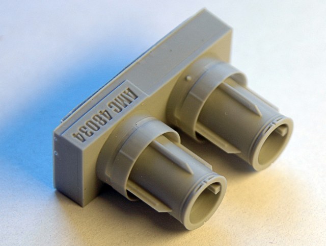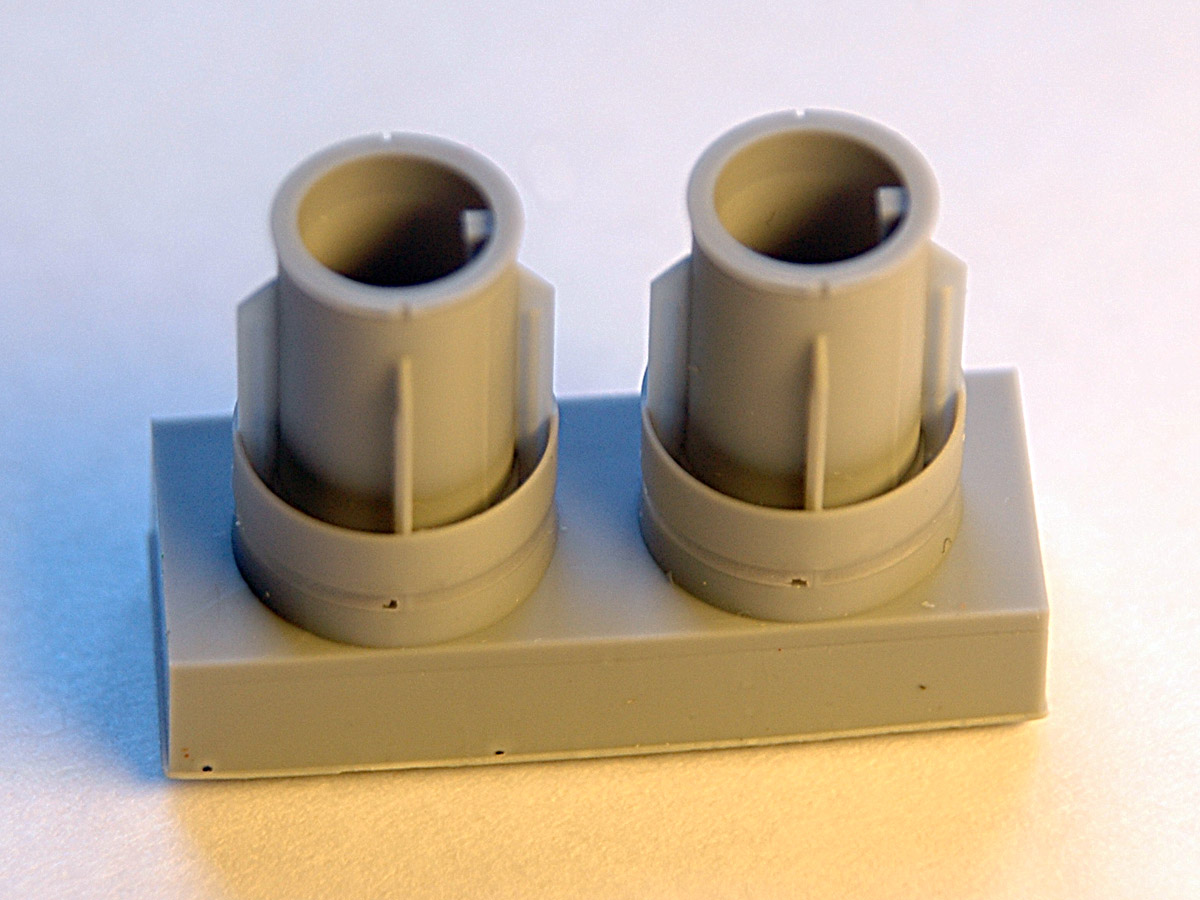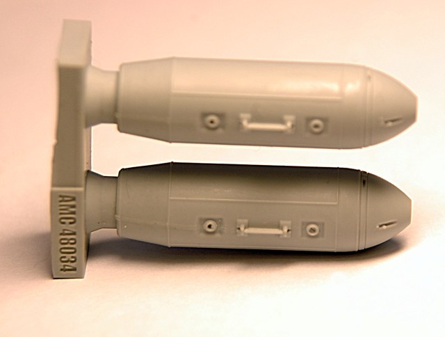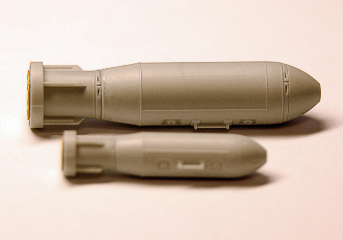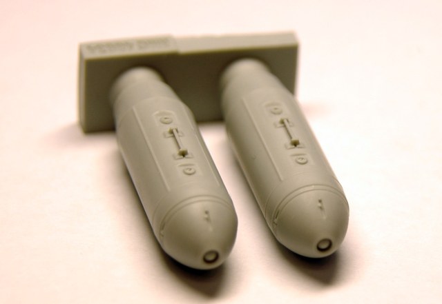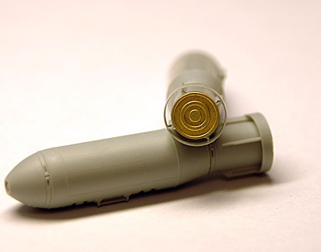 Бомба достаточно фактурная, в носовой части хорошо виден лидер-упредитель, в убранном положении. Внешний вид и геометрические размеры не вызывают сомнений, промерялись реальные образцы на аэродроме и кафедре АСП. Толщина стабилизатора 0,15 мм, что даже немного меньше толщины стандартной фото-травленной пластины (0,16-0,17 мм). Для защиты стабилизаторов от повреждения при транспортировке они защищены вертикальными пилонами. Удаление пилонов не вызывает трудностей, толщина соединяющей перемычки около 0, 1 мм. Хорошо выполнены сварочные швы.