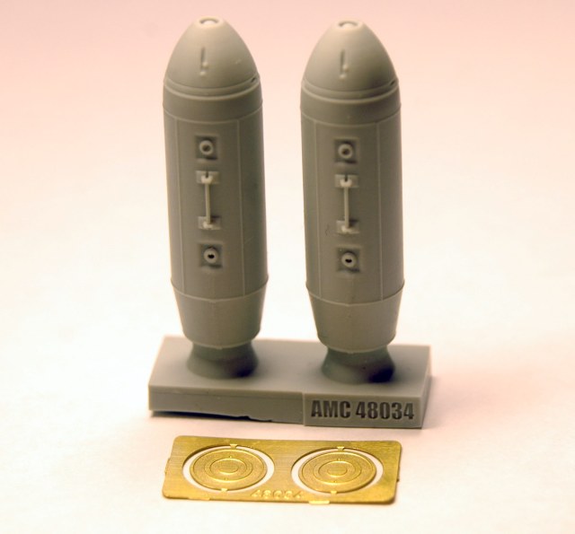 В прозрачном пакете находится буклетик с описанием две отливки и фото-травленная пластинка: одна отливка с хвостовыми, вторая с носовыми частями, а травленные части, это самая задняя часть бомбы. Набор содержит два боеприпаса.
