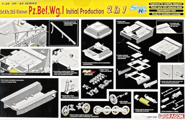 Этот Драгоновский набор, с невзрачной машиной, привлек мое внимание, возможностью сделать довоенные, глухие, немецкие камуфляжи. Думаю, при правильном подходе и подборе красок, может получится весьма зрелищный аппарат. Предлагается три вида окраса: Серый, двух и трехцветные камо. Время: 1936, 1938 годы. Два варианта сборки: С антенной и без.