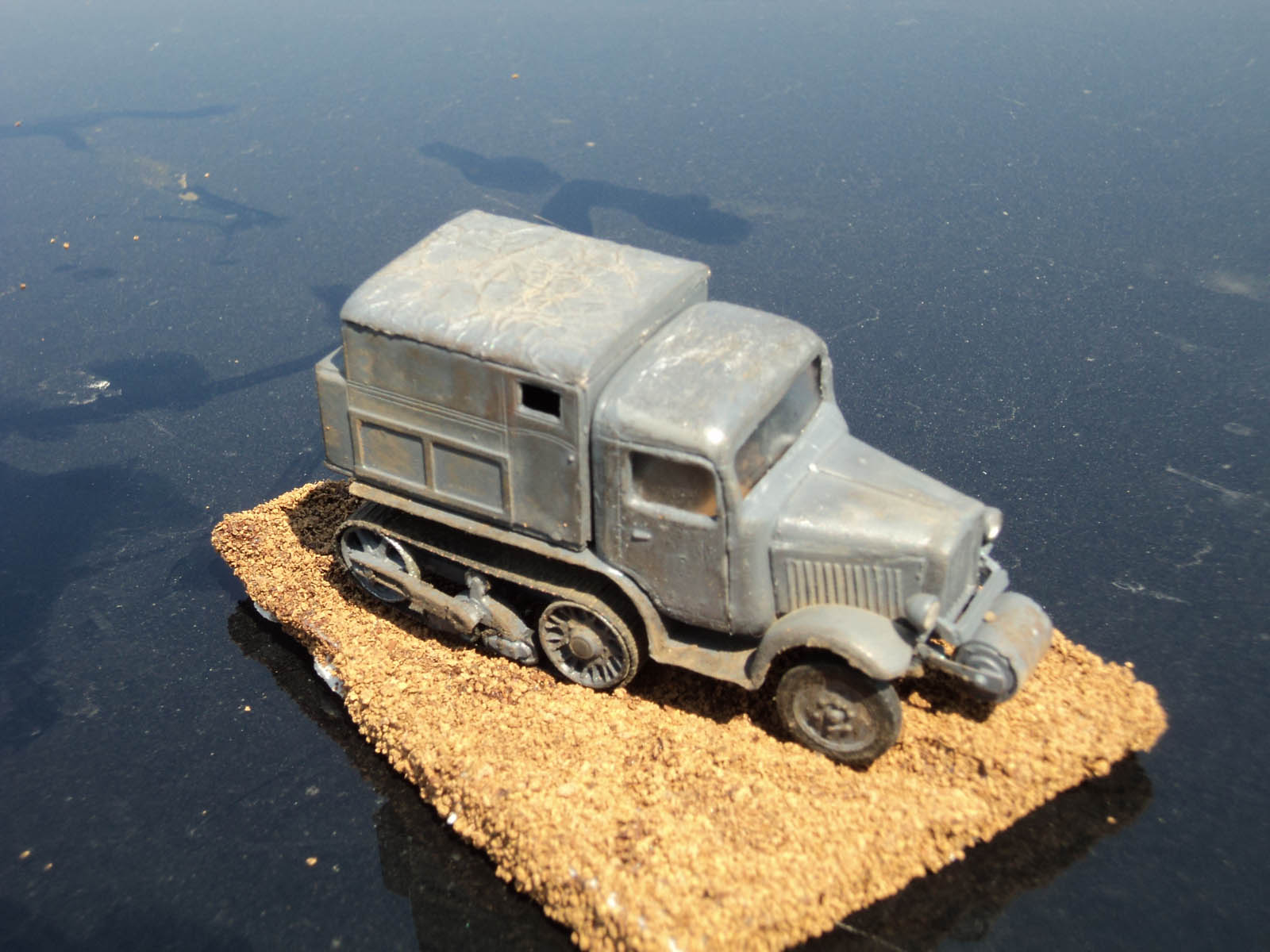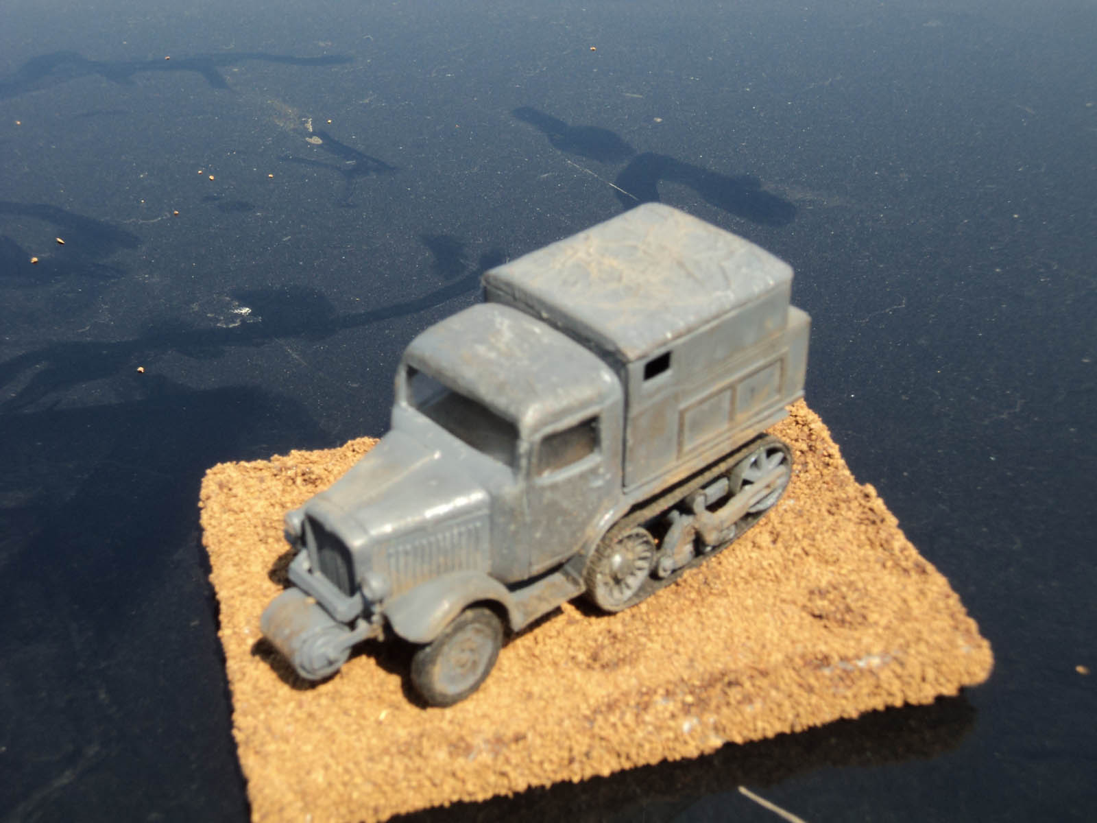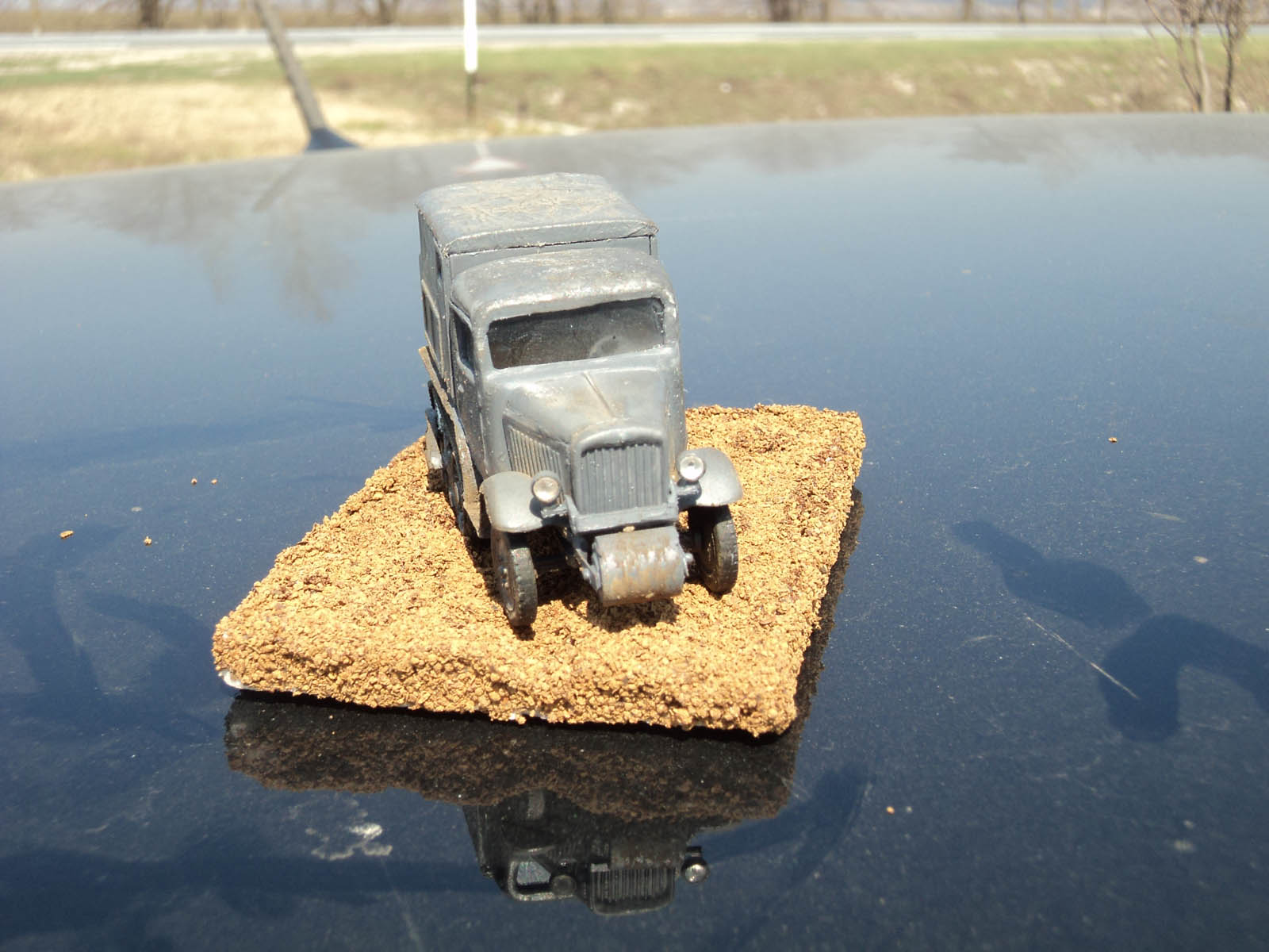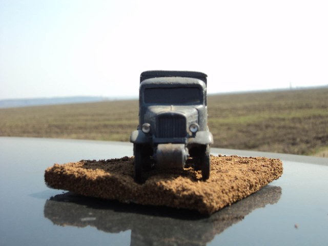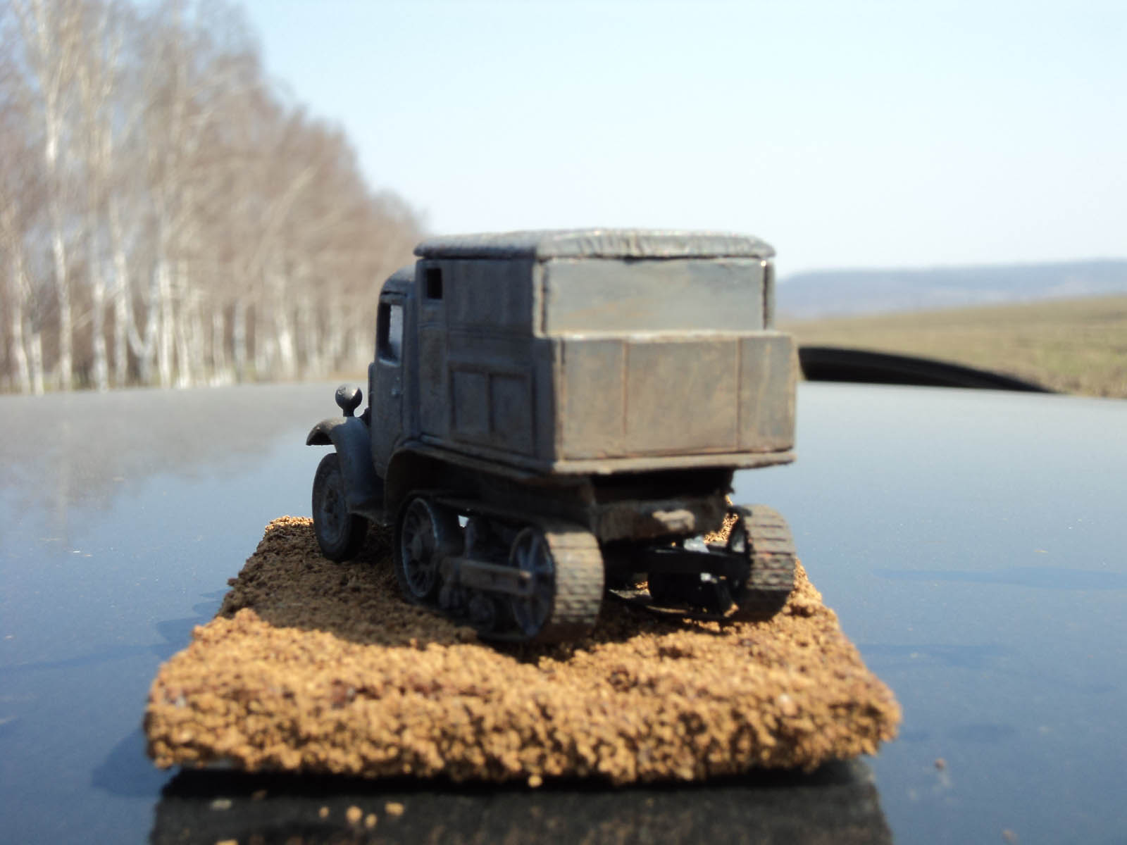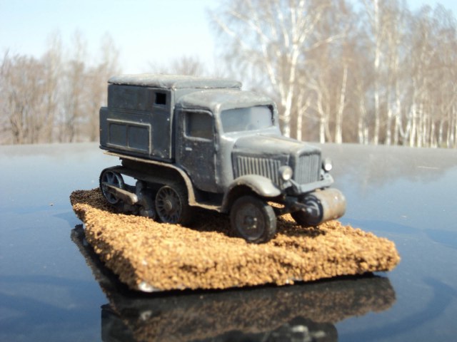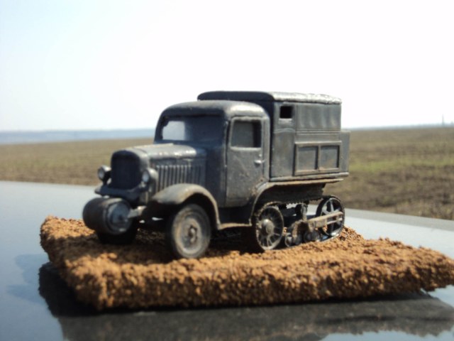 Сборка практически изкоробочная,от себя добавлен тент из упаковочной бумаги,обивка сиденья из неё же,рычаги и педали из проволоки (к сожалению на фото не видны,но они есть).Из жести изготовлены подножки,так как толщине родных в пересчете на масштаб обзавидуется даже "Тигр".Модель облагорожена установкой фар от "Эльфа".Особых проблем в сборке не было,стыкуемость на троечку,но после подгонки все сходилось.