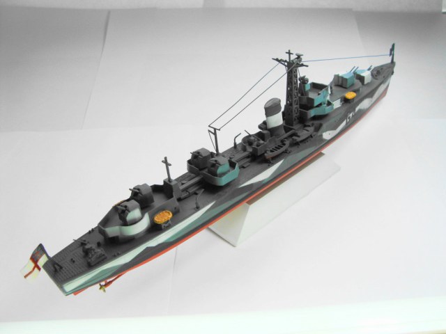 Этот корабль я приобрел в 1983 году, в один из моих редких приездов в Москву. Тогда для меня это было редким приобретением, поскольку в местности где я проживал такие модели не продавали, к стати с тех пор я эту модель в продаже не видел. Можно сказать в честь 30-и летия сборки я решил выставить модель на сайте. Красил ее через 10 лет, когда приобрел аэрограф "Белорус" так, как кистью боялся испортить. Использовал нитрокраску добытую из разных источников, красная и желтая например была "приобретена" родителями на работе там ей красили газовые трубы, а остальные цвета красил уже специальной краской для моделей, неизвестного производителя. Учился я тогда в институте в Ставрополе и там только, что открыли специализированный магазин в нем я в первые увидел краску для моделей и естественно сразу купил, две банки ее до сих пор сохранились, они на последнем фото с тем, самым аэрографом. О шпаклевке и грунтовке я тогда и не думал поэтому на корабле присутствуют утяжины и следы от толкателей. Но тогда я на них внимания не обращал для меня этот эсминец был верхом совершенства. На корпусе расшивка внутренняя, а на надстройках наружная. Как называется этот корабль я понятия не имел, в те годы на коробке писали только индекс не известно по какому каталогу. Источником знания мат. части для меня тогда были журналы: "Техника молодежи", "Моделист конструктор", "Крылья Родины". В этих журналах о иностранной технике писали мало, а о Советской еще меньше. Примерно году так в 1986 мне попалась книга Станислава Катцера "Флот на ладони". В ней был простенький чертеж Английского эсминца типа "М" "Myrmidon". Он был похож на эту модель и я решил, что это его модификация, к стати камуфляж я черпал тоже из этой книги и литера "G" на борту тоже от туда. Когда появился интернет я наконец узнал, что это эсминец типа "Battle", головной корабль был спущен на воду в декабре 1943 года. Участвовать в мировой войне давилось только одному эсминцу этого типа на Тихоокеанском ТВД. Раскрывать ТТХ корабля не вижу смысла, т.к. у всех есть интернет. Модель в маштабе: 1:325.