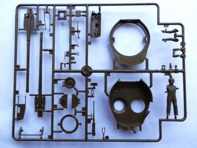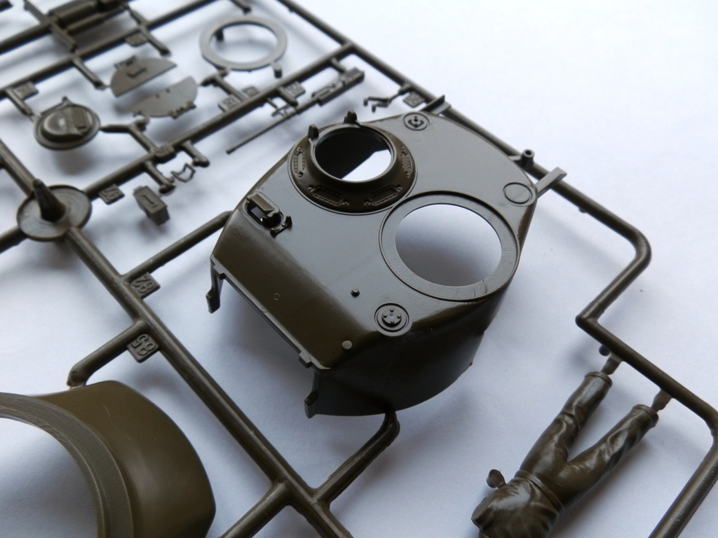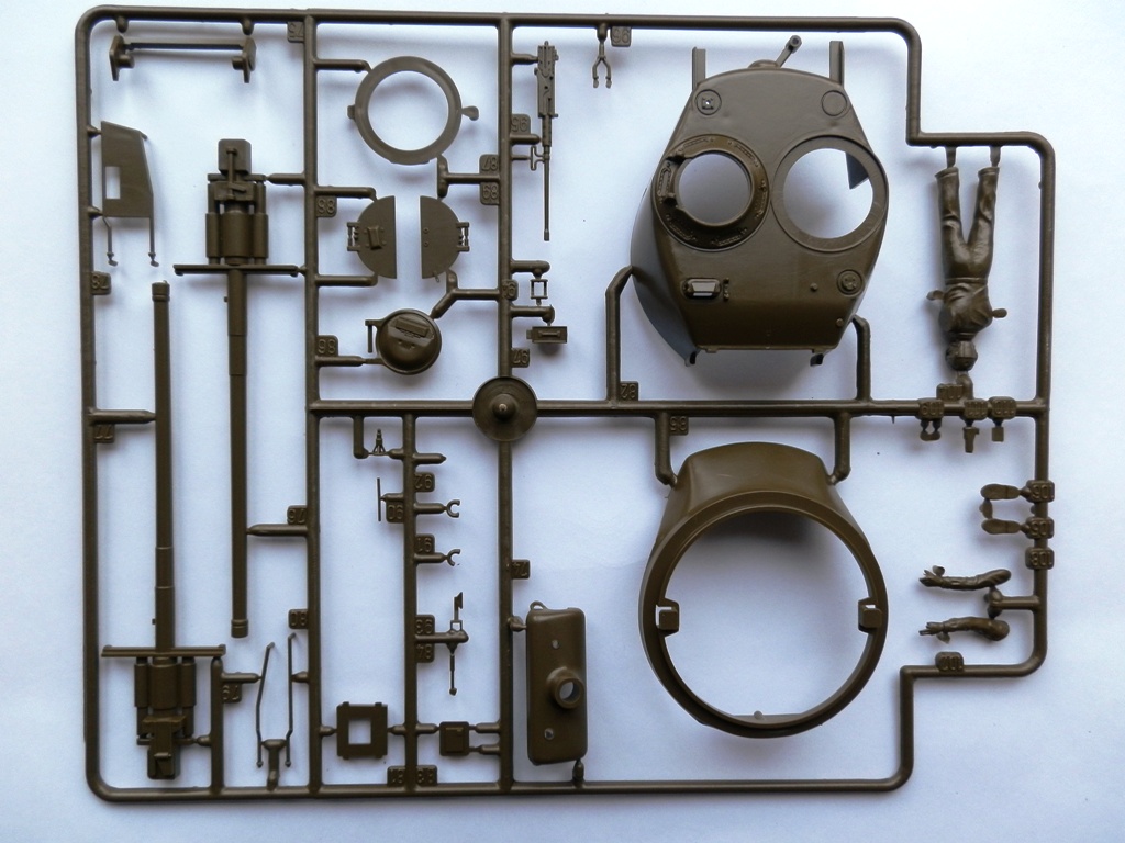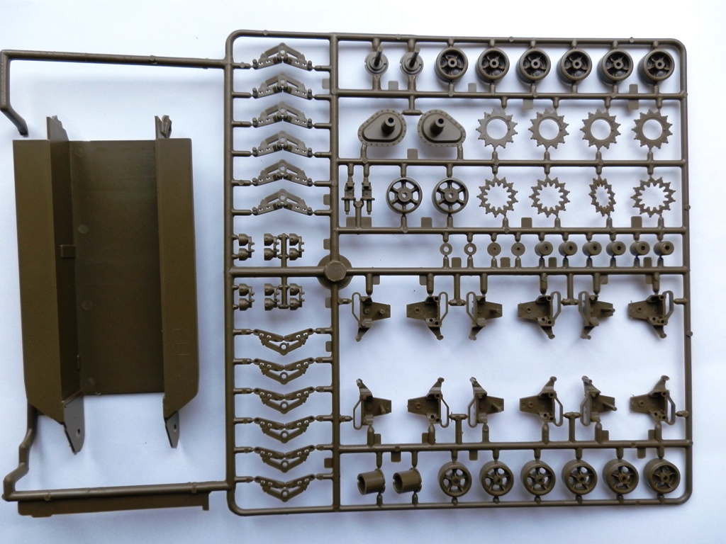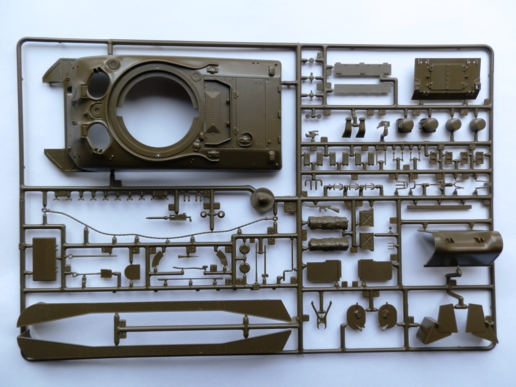Модель упакована в коробку среднего размера, оформлена в фирменном стиле данной фирмы. Внутри находятся три литника с деталями танка, упакованые в целофановый пакет, резиновые гусеничные ленты, декаль на три варианта и инструкция в виде гармошки. Детали весьма неплохого качества, облоя минимум, можно сказать почти нет, проработка деталей на уровне. Утяжины обнаружил только на фальшбортах и крыше башни, следы от толкателей также в скромном количестве. Верх корпуса, башня, лоб корпуса абсолютно гладкие, ни намека на имитацию литой брони, придется имитировать самостоятельно, так как это характерная особенность данной модификации. Траки сомнительного качества, жесткие, присутствуют множественные толкатели на внутренней стороне, желательно на замену. Декаль дается на три варианта американских машин, на Арденнскую операцию, Тихиоокеанский корпус морской пехоты и высадку в Нормандии.