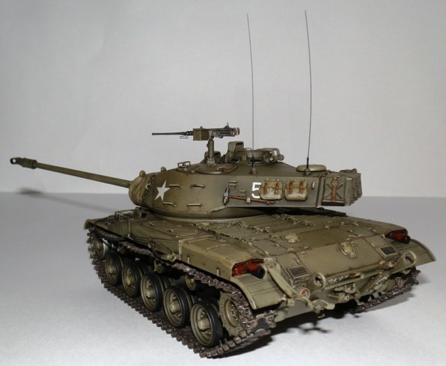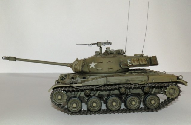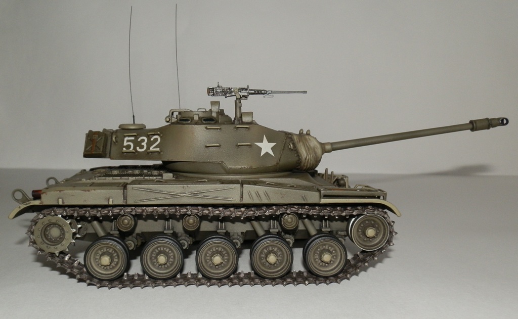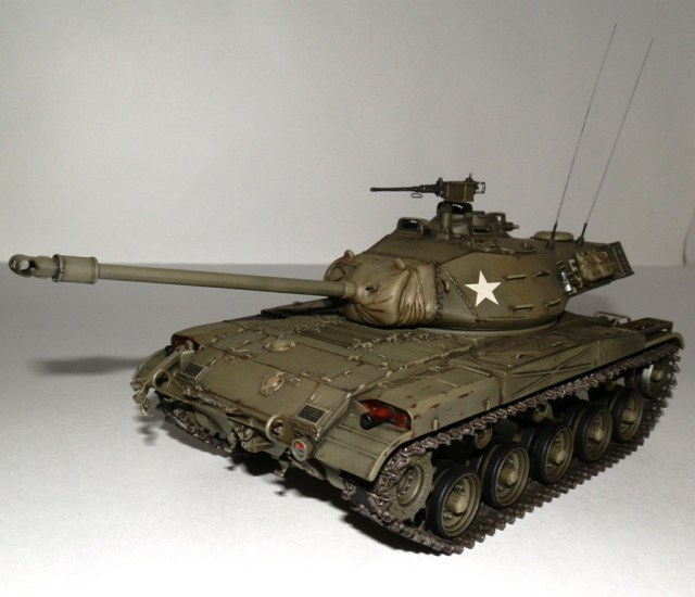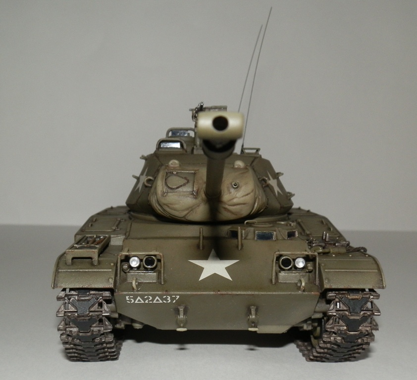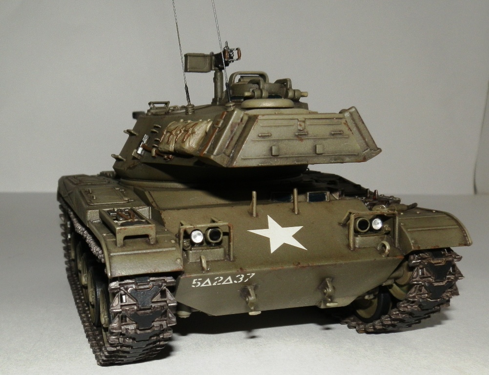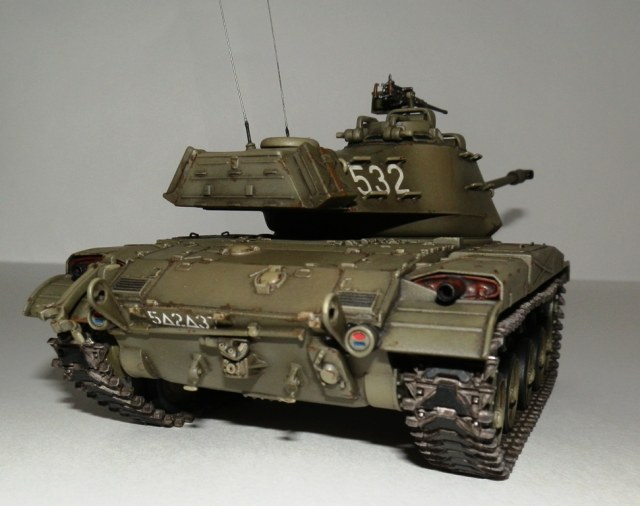 Добрый день уважаемые Коллеги! Позвольте представить еще одну мою завешенную работу- американский легкий танк M 41 “WALKER BULLDOG”. Вообще то американцы не моя тема, но некоторые их машины весьма интересны, к каким и отношу М41. Исходник старая модель от Тамии, обзор я на нее делал М41 Бульдог. Модель весьма упрощена и заточена под моторчик, но несмотря на возраст собирается если не идеально, то близко к тому. Сначала хотел собрать из коробки, но затем все же решил доработать по мере сил и возможностей. Из доработок по корпусу - закрыл надгусеничные ниши, сделал выштамповки на ящики ЗИП и ручки из проволоки. Сделал крепления и повесил металлический трос, подправил ограждения фар и сами фары, на лобовом листе сделал буксировочные рымы и "рога" в верхней его части. Приборы наблюдения мехвода - пленка, покрашеная с обратной стороны темно-синим металликом. Также доработал башню, вылепил из эпоксилина, обрезков литников и пластика от доширака чехол маски пушки. Сделал выпуклые сварные швы, у Тамии они были утопленные. Заменил часть поручней на проволочные, добавил ограждение прибора наблюдения и сами приборы из той же пленки. Зенитный пулемет поставил от Дрегона, добавив к нему проволочную ручку, у Тамии он был весьма убогий. Антенны-тянутый литник. Рюкзаки от Тамиевского шермана. Спареный пулемет-игла. Резиновые траки из набора не выдерживали никакой критики-заменил на Фриул, чернил в уксусе, затем покрасил акрилом от Валехо "асфальтовые" подушки и тонировка маслом.