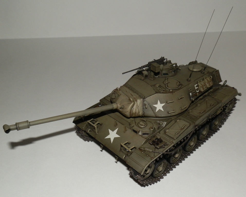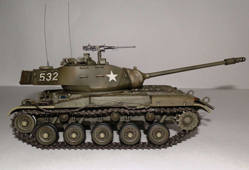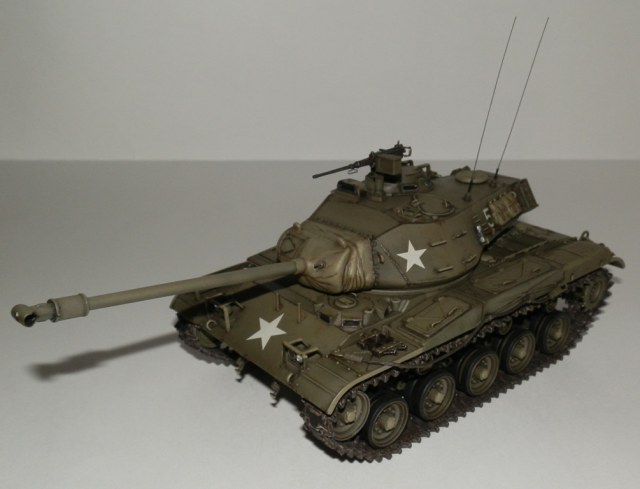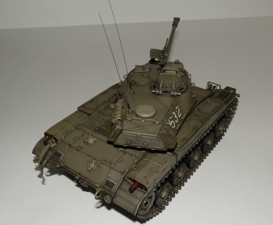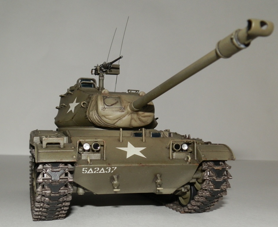 Добрый день уважаемые Коллеги! Позвольте представить еще одну мою завешенную работу- американский легкий танк M 41 “WALKER BULLDOG”. Вообще то американцы не моя тема, но некоторые их машины весьма интересны, к каким и отношу М41. Исходник старая модель от Тамии, обзор я на нее делал М41 Бульдог. Модель весьма упрощена и заточена под моторчик, но несмотря на возраст собирается если не идеально, то близко к тому. Сначала хотел собрать из коробки, но затем все же решил доработать по мере сил и возможностей. Из доработок по корпусу - закрыл надгусеничные ниши, сделал выштамповки на ящики ЗИП и ручки из проволоки. Сделал крепления и повесил металлический трос, подправил ограждения фар и сами фары, на лобовом листе сделал буксировочные рымы и "рога" в верхней его части. Приборы наблюдения мехвода - пленка, покрашеная с обратной стороны темно-синим металликом. Также доработал башню, вылепил из эпоксилина, обрезков литников и пластика от доширака чехол маски пушки. Сделал выпуклые сварные швы, у Тамии они были утопленные. Заменил часть поручней на проволочные, добавил ограждение прибора наблюдения и сами приборы из той же пленки. Зенитный пулемет поставил от Дрегона, добавив к нему проволочную ручку, у Тамии он был весьма убогий. Антенны-тянутый литник. Рюкзаки от Тамиевского шермана. Спареный пулемет-игла. Резиновые траки из набора не выдерживали никакой критики-заменил на Фриул, чернил в уксусе, затем покрасил акрилом от Валехо "асфальтовые" подушки и тонировка маслом.