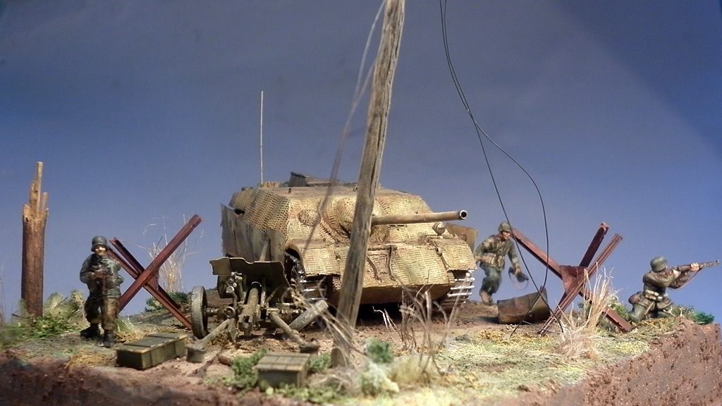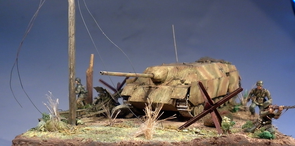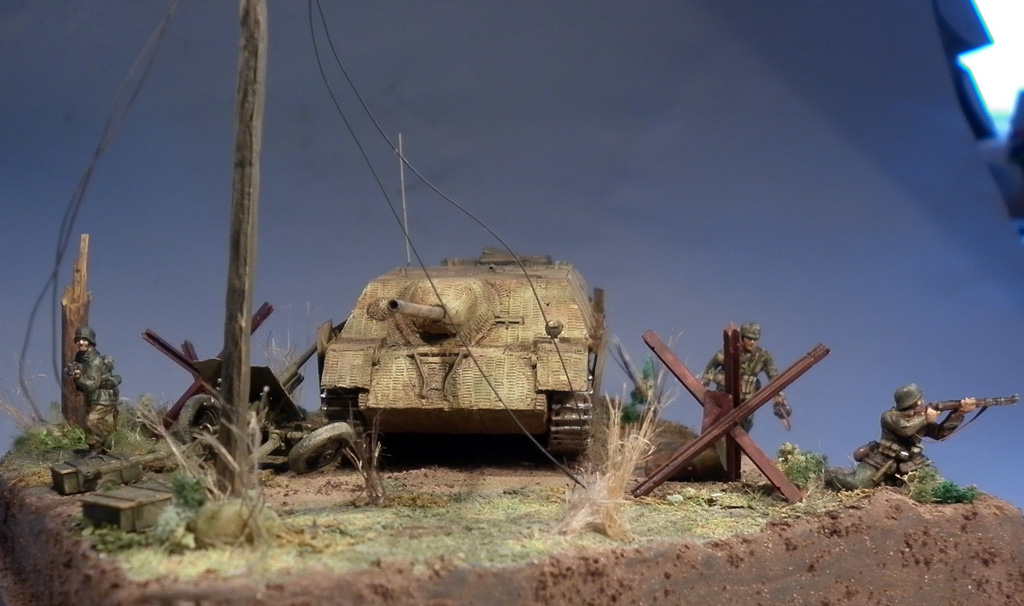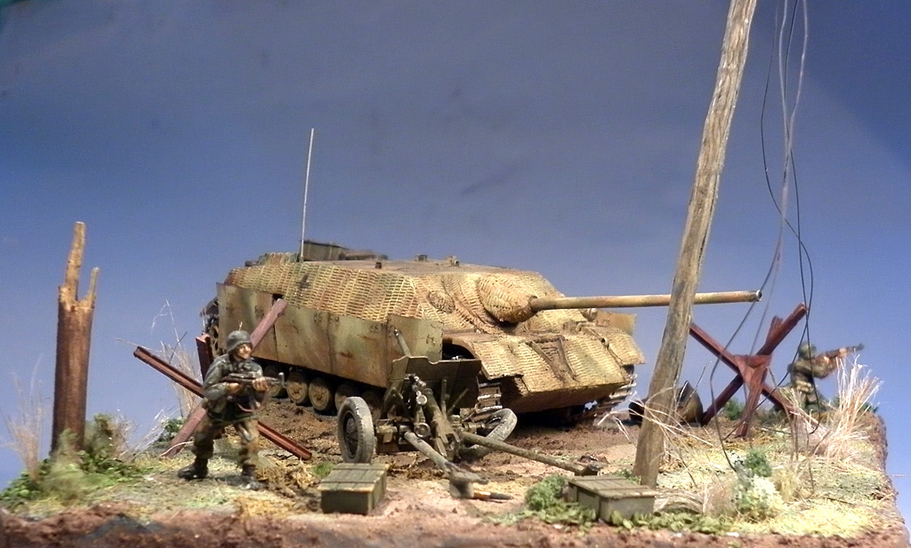 Итребитель танков от Esci, фигурки из наборов Revell, аксессуары - наборы Italeri, листва, трава - Noch. Гусеницы на танке бумажные, т.к. родные просто мусор. Циммерит самодельный из "миллипута".