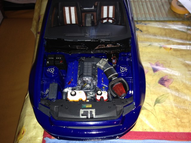 Доброго времени суток! Я тут человек новый и многого еще не знаю :) Вообщем хочу представить свою модель, выкатил буквально вечером из салона, с запахом краски и лака. Предыстория такова, что это мой первенец и в силу того, что в момент появления меня в магазине моделей, то что я построил в другом масштабе отсутствовало :))) но хотелось именно построить шелби... поэтому пришлось приобретать масштаб 1:12, кит достаточно неплохого качества, и как говорят профессионалы ( потряс коробку сама собралась ) :))) сборка была практически без применения каких либо дополнений, потому как оказалось на такой масштаб найти что то достаточно сложно. Вообщем пришлось применять сподручные материалы которые находил походу сборки дома :))) и некоторые из них поистечении долгих лет в шкафах и ящиках нашли свои применения (динамики на полку заднего стекла, фальга, ткань для эмитации покрытия потолка внутри салона, ну и конечно же моя гордость что я все таки смог вкорячить свет, также из подручного материала, более того аккумулятор которого заряжаеться от провода USB. (наталкнул меня на эту идею мой друг который уже несколько лет собирает масштаб 1:24, типа почему нет :) вопрос для меня вставал "как это воплотить?" краски и лаки применялись восновном revell и tamiy плюс аэрограф и компрессор также позаимствованный на постройку, плюс использованны иновации и применения полироли используемой на реальных авто :) конечно без каких то мелких косяков не обошлось и некоторые вещи приходилось разбирать и переделывать также как и перекрашивать... в целом я даволен результатом проделанной работы... Вообщем, что еще сказать критикуйте ))))