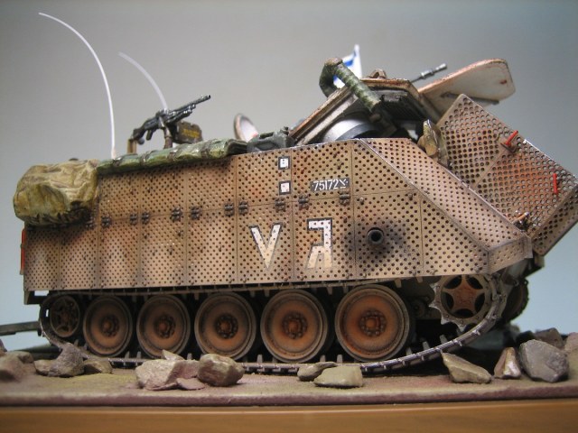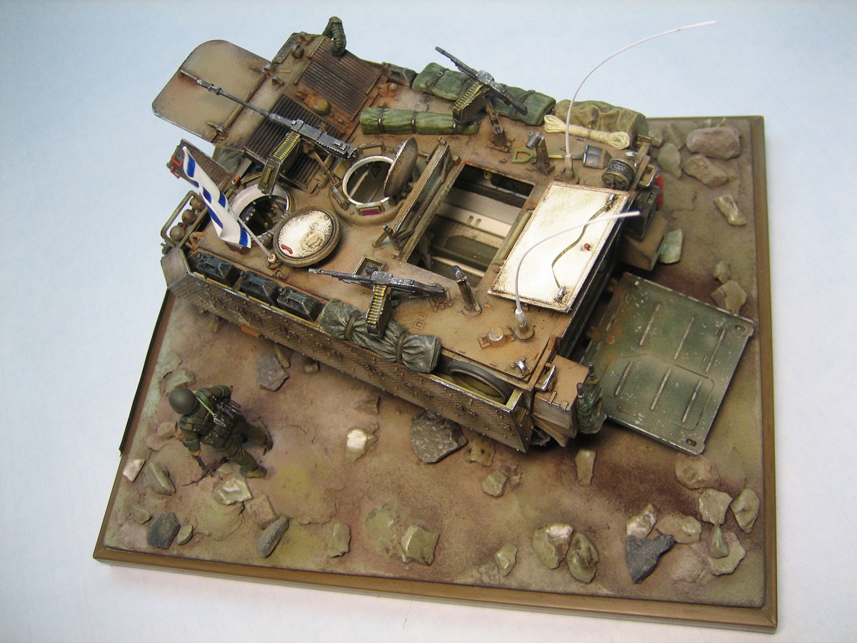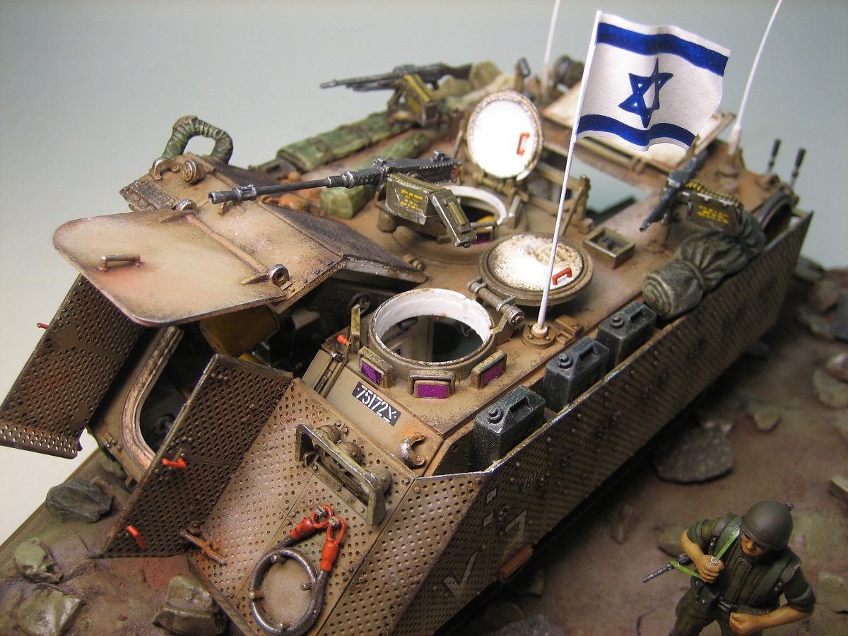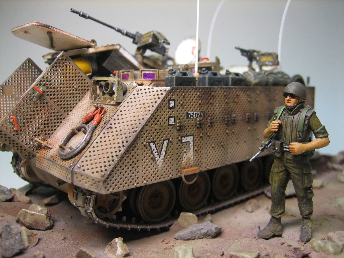 Привет всем. Представляю модель американского БТРа в израильском исполнении. Кит понравился деталировкой движка и интерьера. Собиралась очень хорошо. От себя много чего добавил, долго перечислять ;) Самое трудоемкое было сделать на открывающихся створках около 600 отверстий !!!. Добавил подставку под каменистую пустыню и пехотинца. Краски-Тамия. Масло и пастель по вкусу :). Всем приятного просмотра.