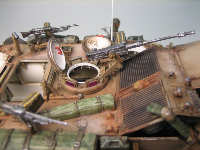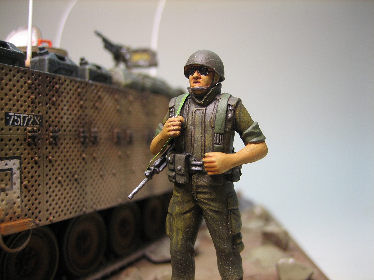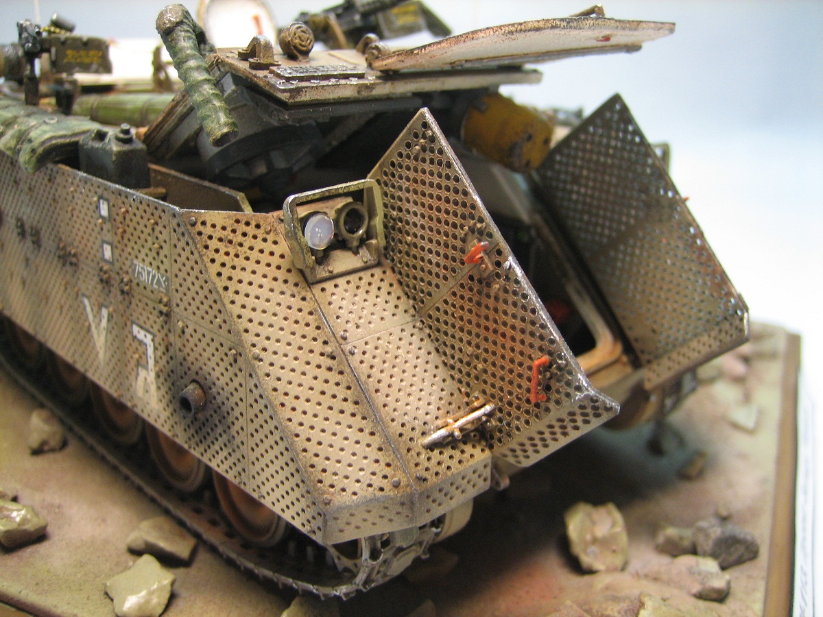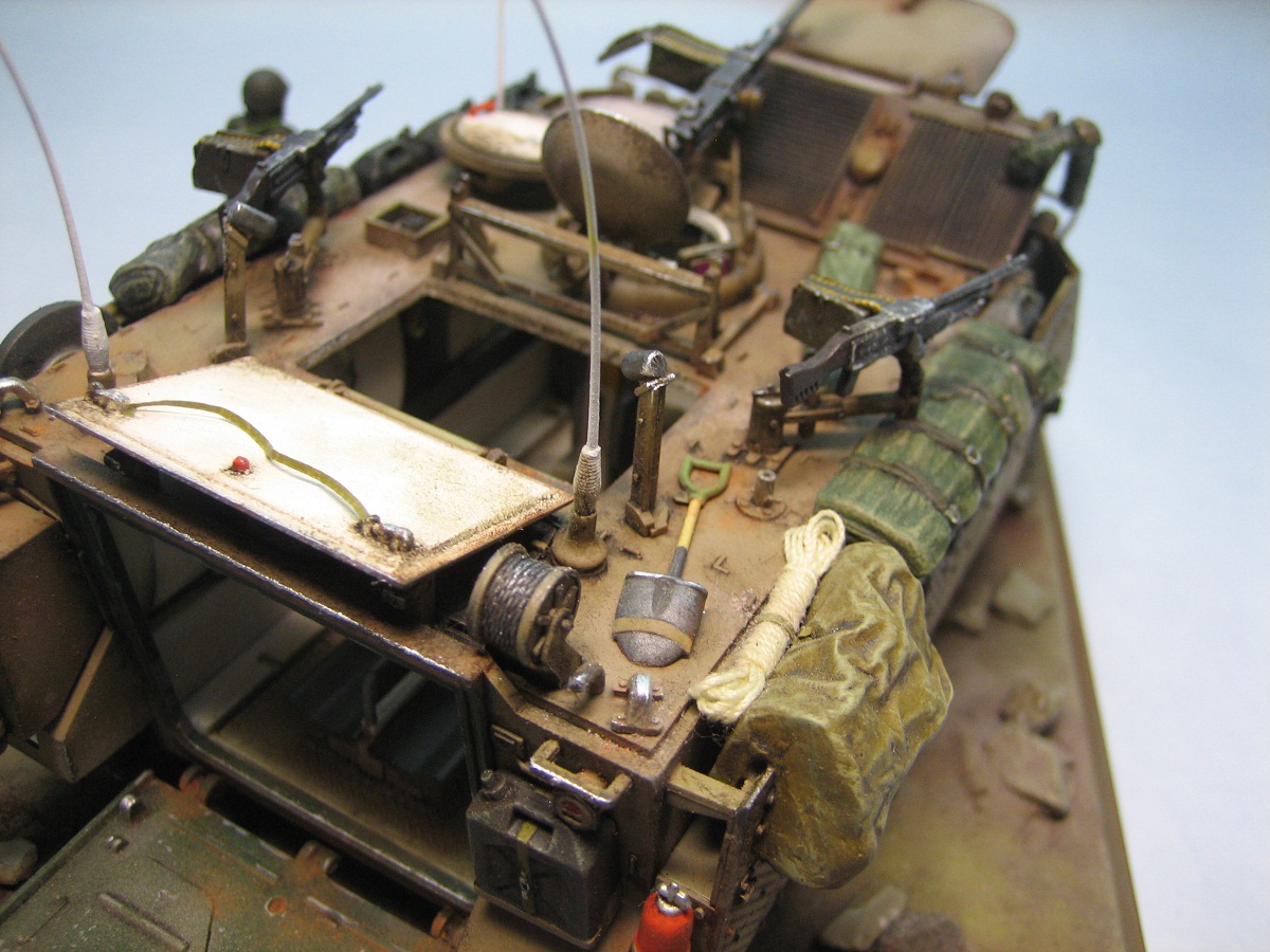 Привет всем. Представляю модель американского БТРа в израильском исполнении. Кит понравился деталировкой движка и интерьера. Собиралась очень хорошо. От себя много чего добавил, долго перечислять ;) Самое трудоемкое было сделать на открывающихся створках около 600 отверстий !!!. Добавил подставку под каменистую пустыню и пехотинца. Краски-Тамия. Масло и пастель по вкусу :). Всем приятного просмотра.