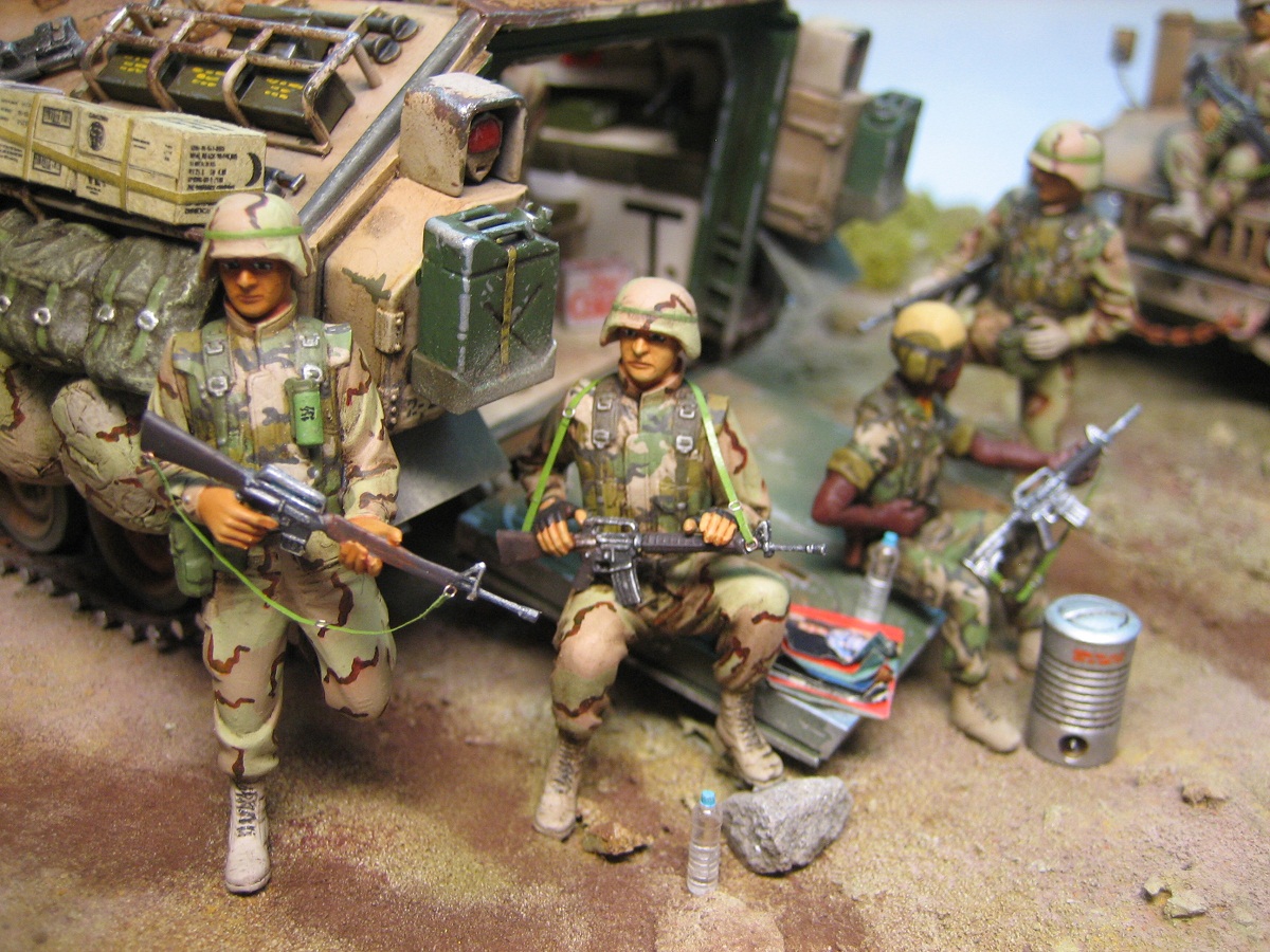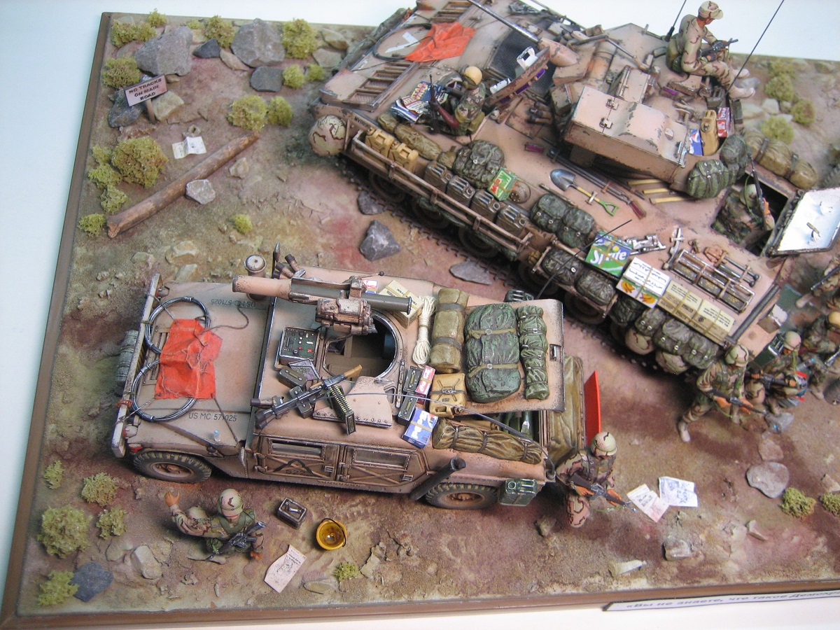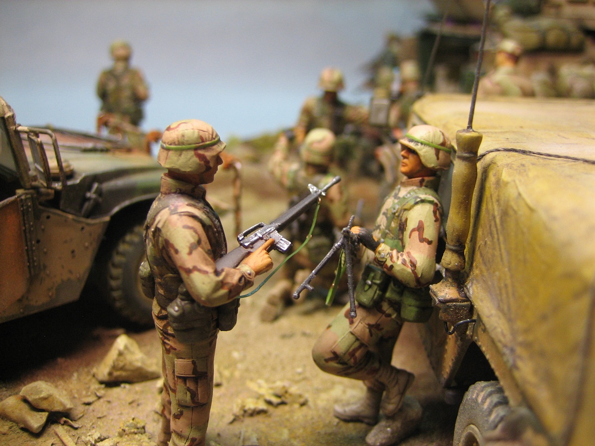 Доброго дня . Выставляю на обсуждения диораму на тему Ирака, " Буря в пустыне " с сатирическим названием. Образ и сюжет собирательный, географической и исторической привязки не имеет. Вся техника- всем знакомые наборы Академи, пехотинцы- перепиленные ICM. Добавлял от себя ОЧЕНЬ МНОГО всего,ОЧЕНЬ ДОЛГО перечислять :))). Краски-Тамия. Смывка-масло. Пыль-пастель. Всем приятного просмотра.
