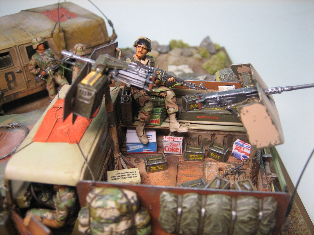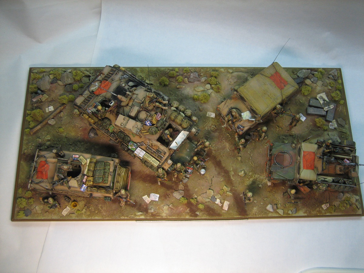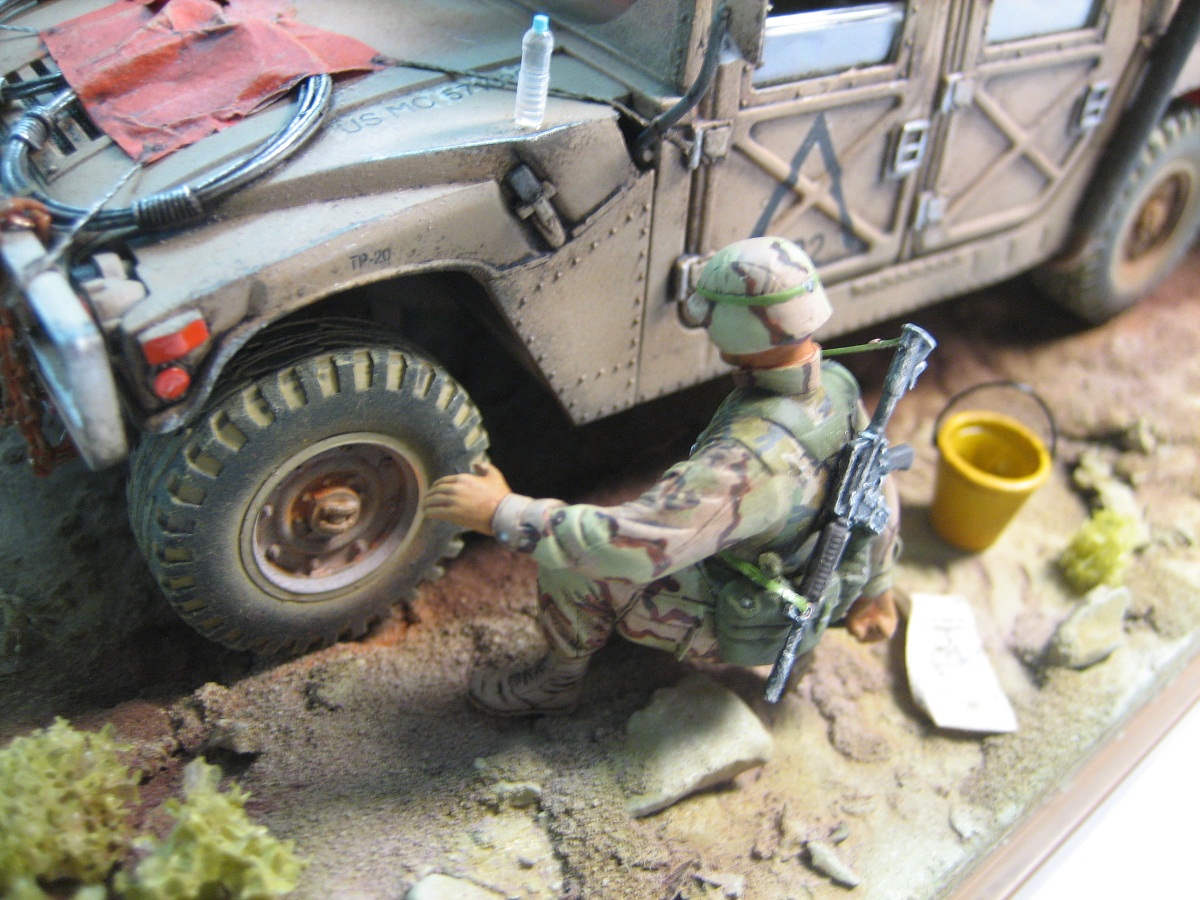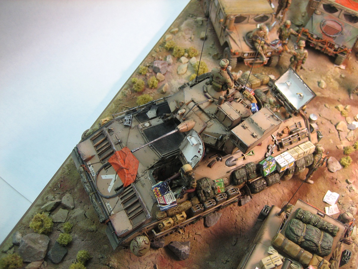 Доброго дня . Выставляю на обсуждения диораму на тему Ирака, " Буря в пустыне " с сатирическим названием. Образ и сюжет собирательный, географической и исторической привязки не имеет. Вся техника- всем знакомые наборы Академи, пехотинцы- перепиленные ICM. Добавлял от себя ОЧЕНЬ МНОГО всего,ОЧЕНЬ ДОЛГО перечислять :))). Краски-Тамия. Смывка-масло. Пыль-пастель. Всем приятного просмотра.