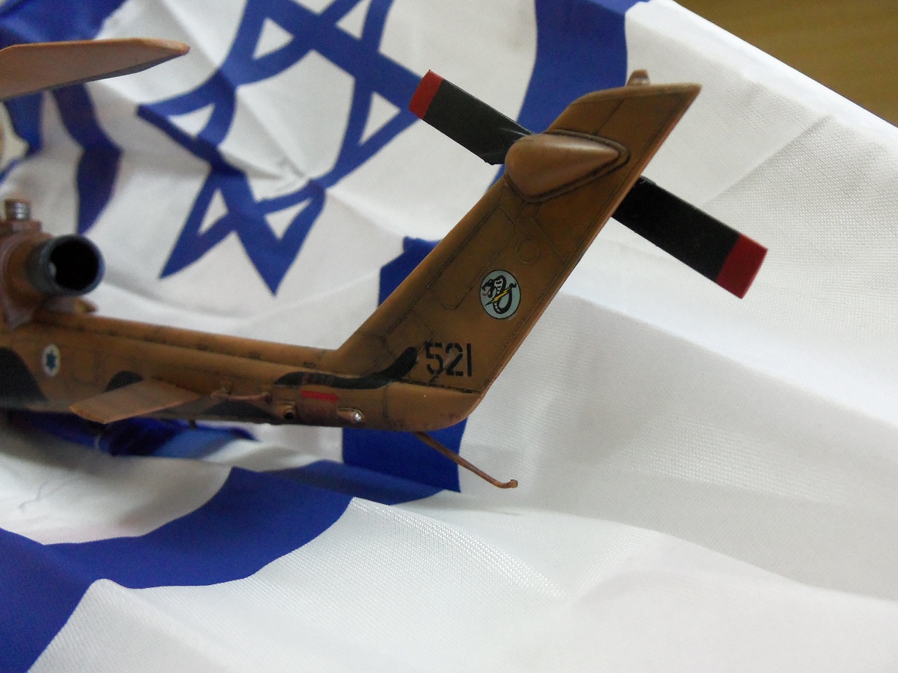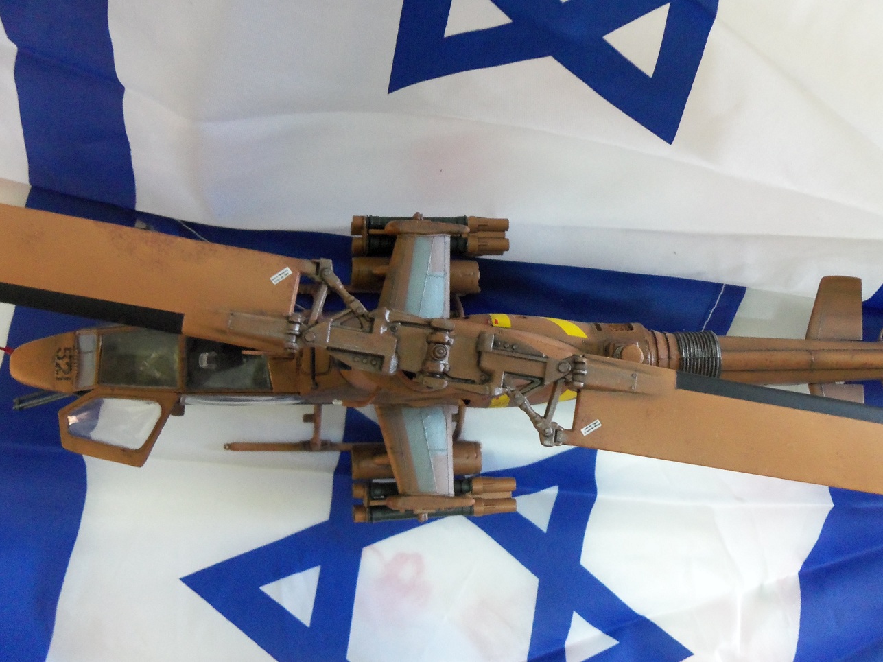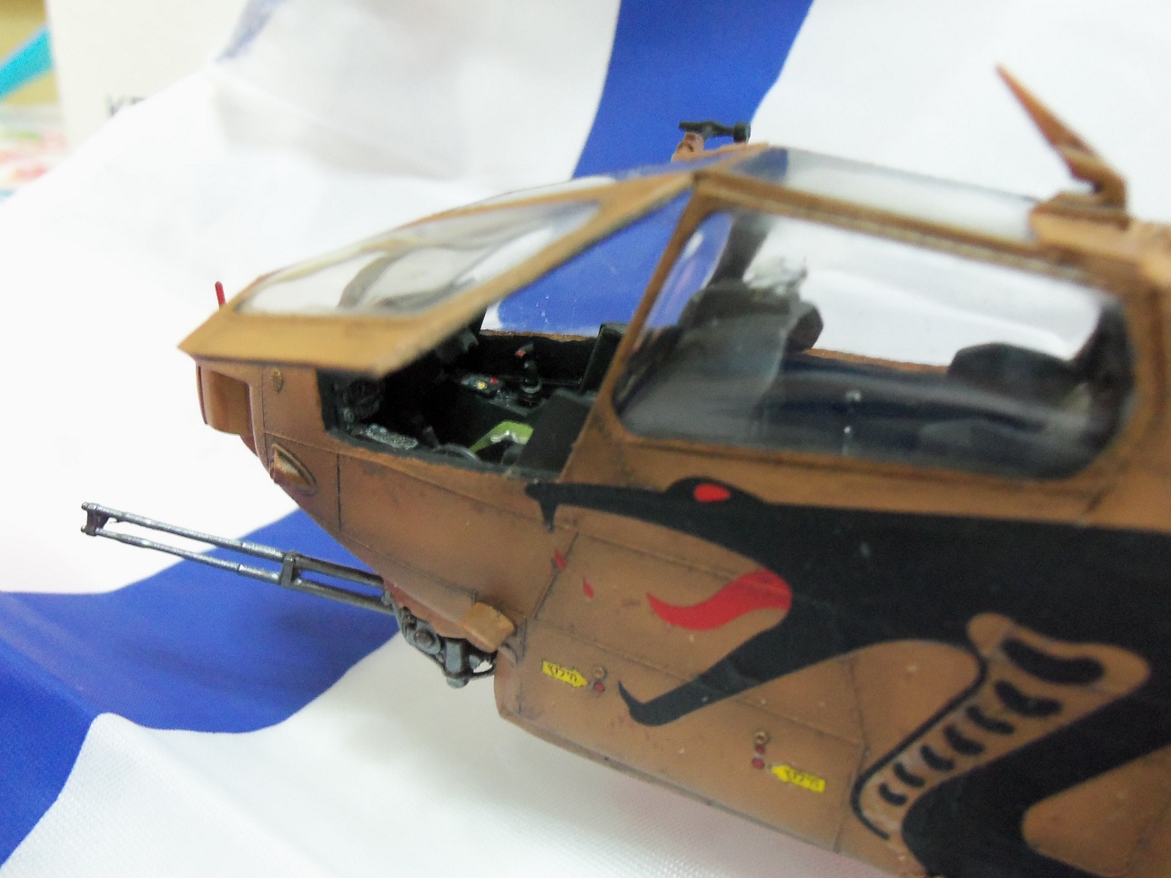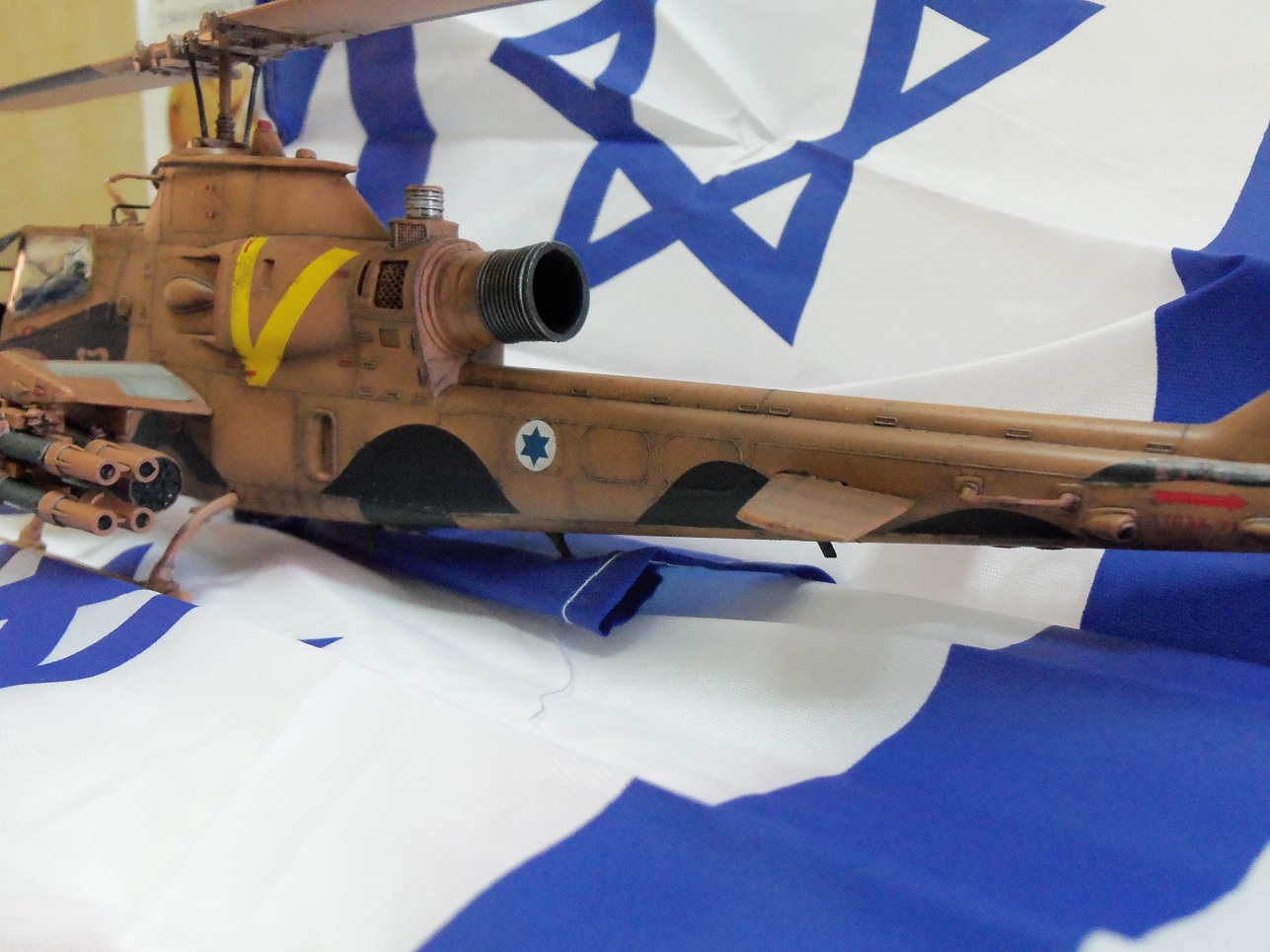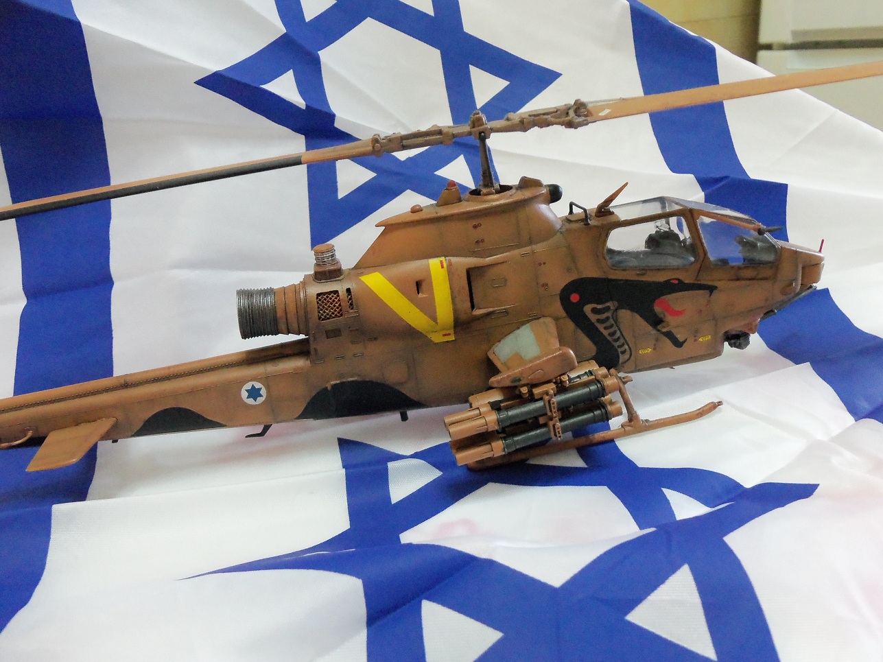Хочу представить вашему вниманию мою очередную модель. Израильская версия вертолёта Кобра, на иврите "Тцефа", южной базы ВВС Израиля Пальмахим. Строилась она довольно долго и изкоробочно, доработал только сетку над двигателем из мелкого ситичка. Модель задуманна для небольшой диорамки (как сделаю выложу) в авиавыставке в которой по задумке будет присудствовать сама модель собственно, огнетушитель на асфальте, небольшой стенд с надписью на иврите "Осторожно, вертолёт в боеготовности!!!". По сути самой модели- красил акрилом от Vallejo, смывка Mig, лак первый раз пробовал под аэр полиуретановый глянец тоже Vallejo, вроде нечего. Нанёс сколы небольшой ржавчины губкой дабы добавить поюзаности малость потому как именно вертолёты авиа базы Пальмахим рабочие лошадки юга Израиля, работают часто и в основном в небе Газы, на их счету много ликвидаций боевиков Хамаса и они принемали активное участие в операции Литой Свинец в Газе. Имеется друган который служил в ВВС Израиля, по его инфе вертолёты не сильно ухоженны в плане косметики потому как нужны всегда и нет времени "ногти красить" к тому же юг страны и весь округ Газы в общем это сухое, по большей части времени года пыльное место- оттуда попытка имитации поюзаности машины. Вообщем не судите строго, попытался сфоткать красиво, критикуйте, все записываю! Приятного просмотра.