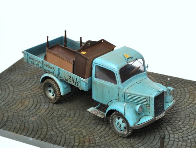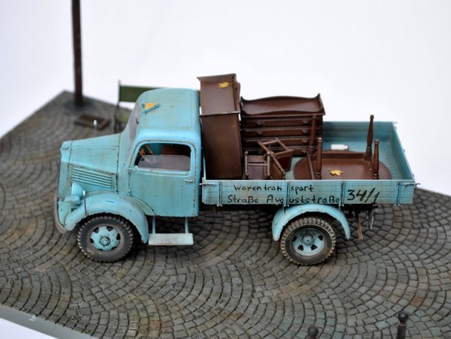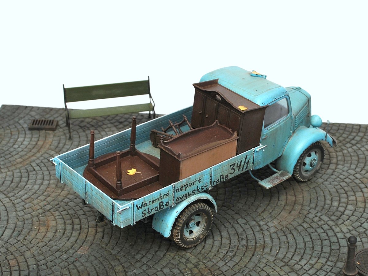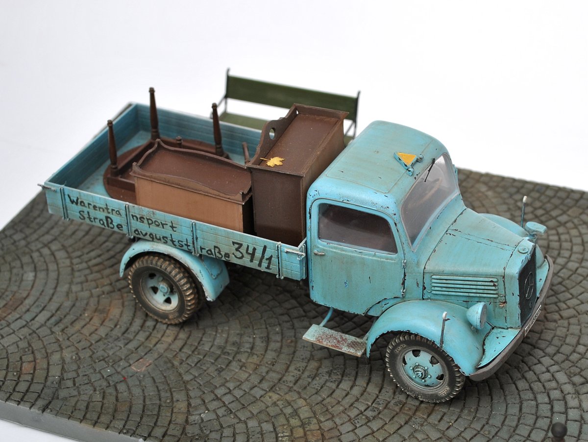 Грузовик понравился, живой, но не без недостатков: номера военные, решетка радиатора забита краской возле знака мерседес, знак автопоезда назад не опускается, про двойную strasse сказали. В кузове не хватает мелочей, крышки мебели можно было бы припылить (вспомните сколько пыли собирается на крыше такого же серванта), два огромных листа улыбнули. Поворотников в комплекте нет?