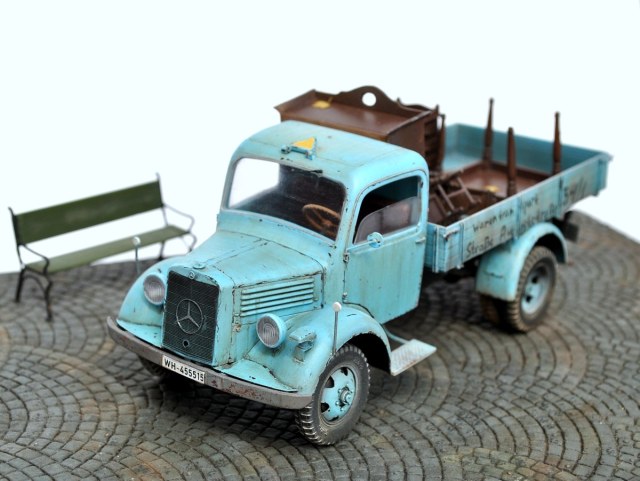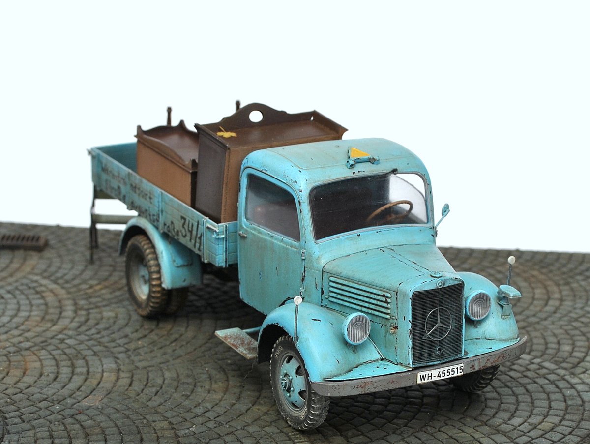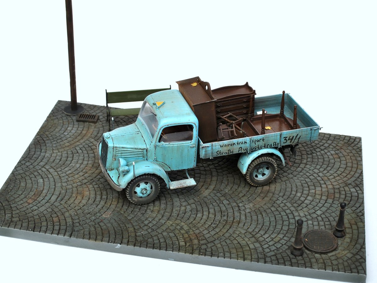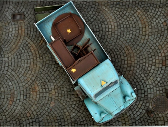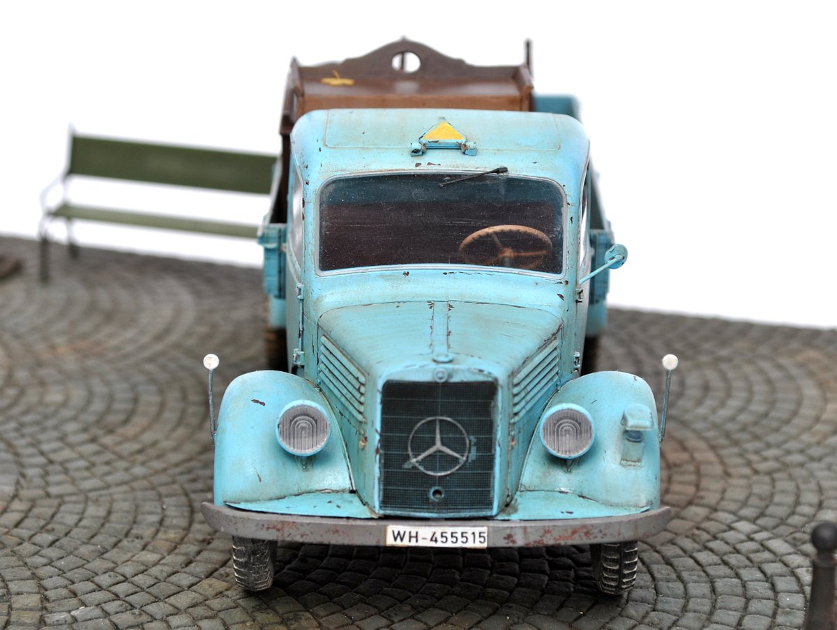 Грузовик понравился, живой, но не без недостатков: номера военные, решетка радиатора забита краской возле знака мерседес, знак автопоезда назад не опускается, про двойную strasse сказали. В кузове не хватает мелочей, крышки мебели можно было бы припылить (вспомните сколько пыли собирается на крыше такого же серванта), два огромных листа улыбнули. Поворотников в комплекте нет?