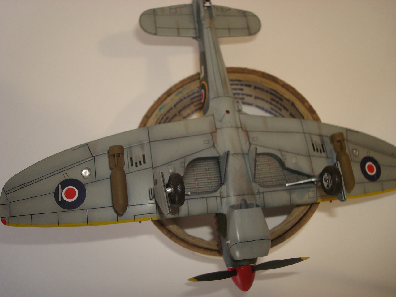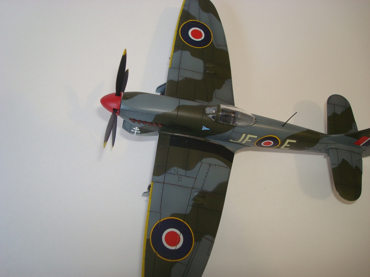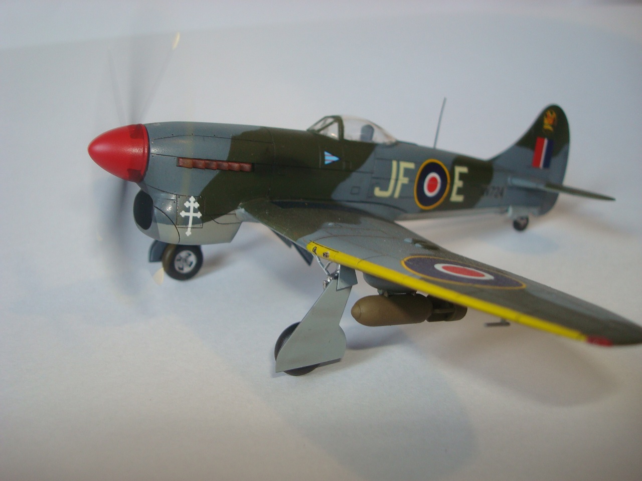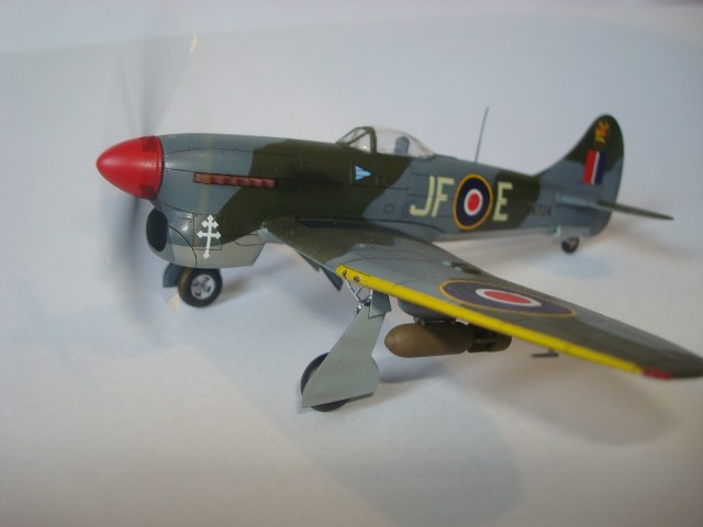 Но есть много мелких неточностей. Насколько я понял, желтый сигнальный по передней кромке крыла на пушечные порты не заходил - только до прикрывающей панели. Разделительная линия камуфляжа (верх-низ)шла ниже креста Свободной Франции. 500- фунтовки подвешивались в другом положении (оперение). Антенна на фюзеляже получилась переразмеренной, что по толщине, что в высоту. И т.д.