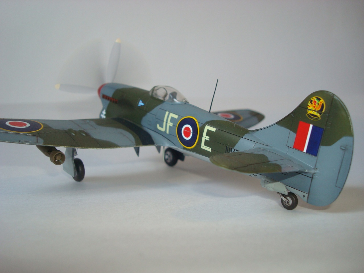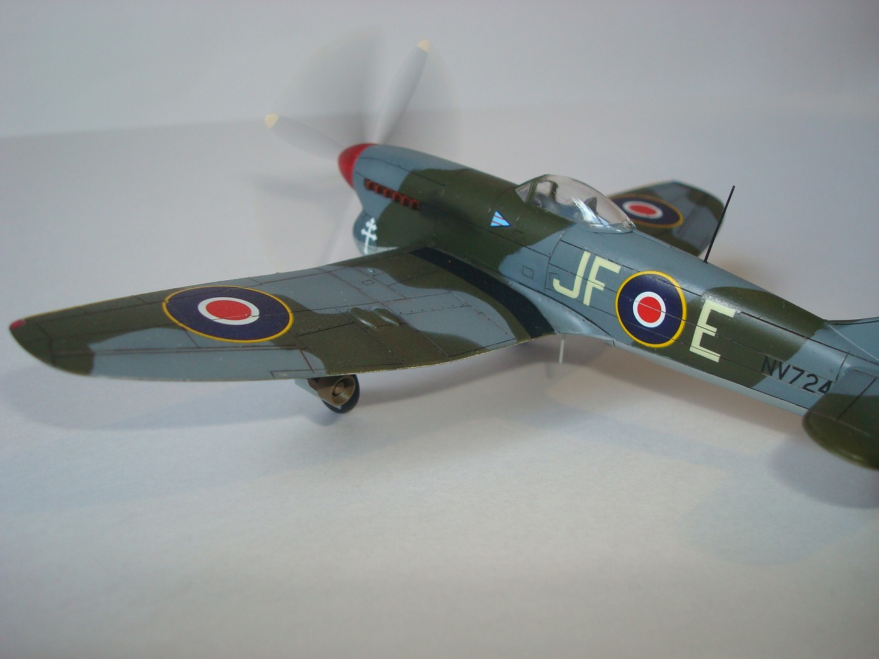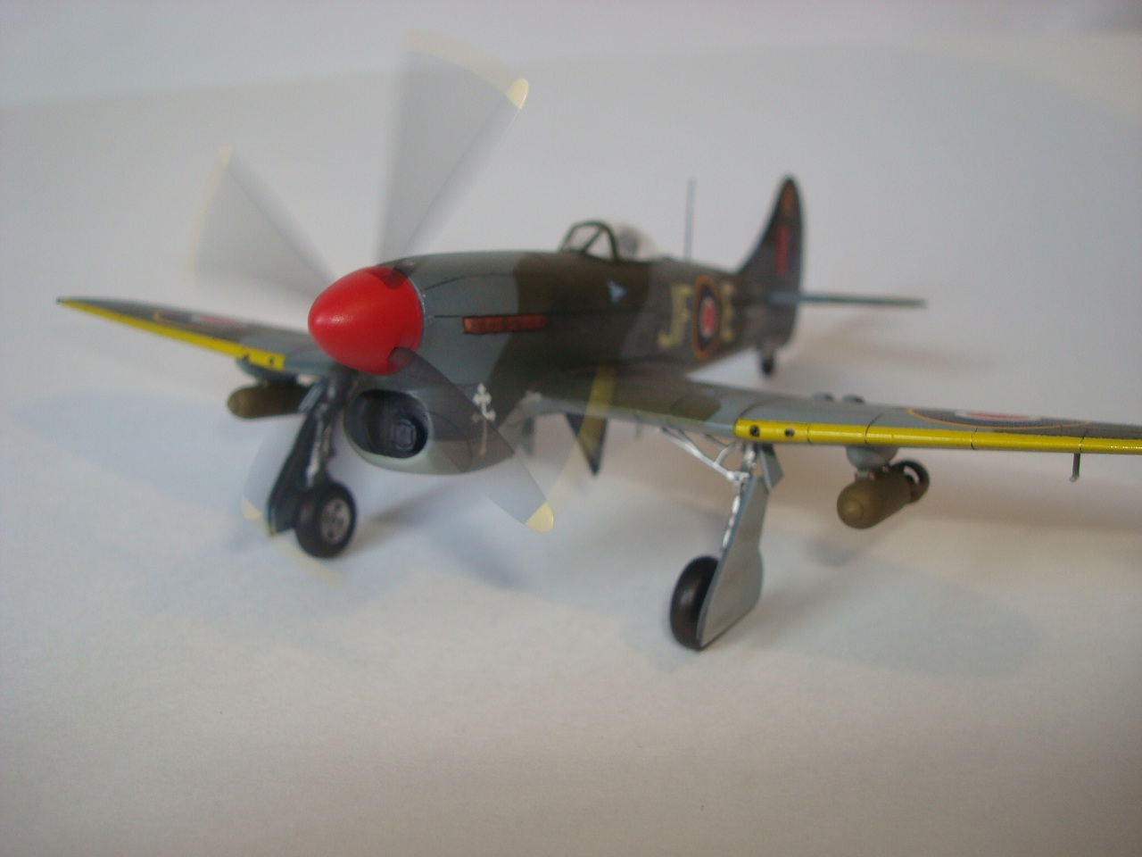 Но есть много мелких неточностей. Насколько я понял, желтый сигнальный по передней кромке крыла на пушечные порты не заходил - только до прикрывающей панели. Разделительная линия камуфляжа (верх-низ)шла ниже креста Свободной Франции. 500- фунтовки подвешивались в другом положении (оперение). Антенна на фюзеляже получилась переразмеренной, что по толщине, что в высоту. И т.д.