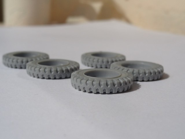Изначально мы имеем пять колес (4 основных и запаску) каждое из которых формируется из ступицы и шины. Колесные диски очень подробно, с хорошим контурами, присутствуют вырезы для облегчения и даже имеют имитацию ниппеля на ободе. С внутренней стороны есть неплохие тормозные барабаны, но их все равно вряд-ли будет видно после сборки.