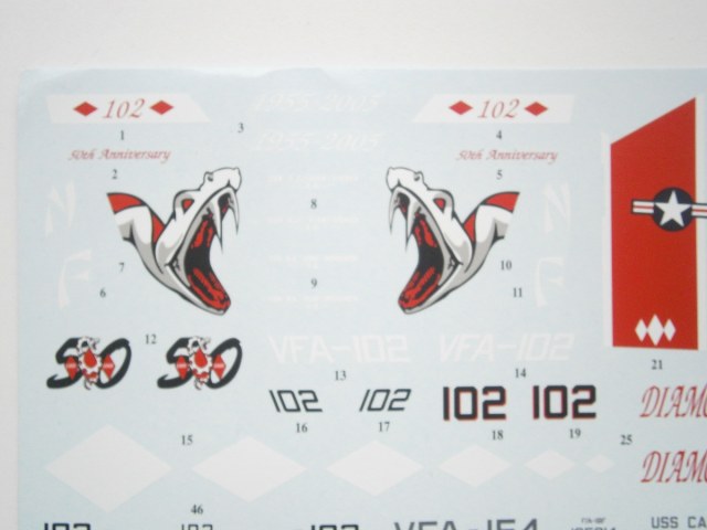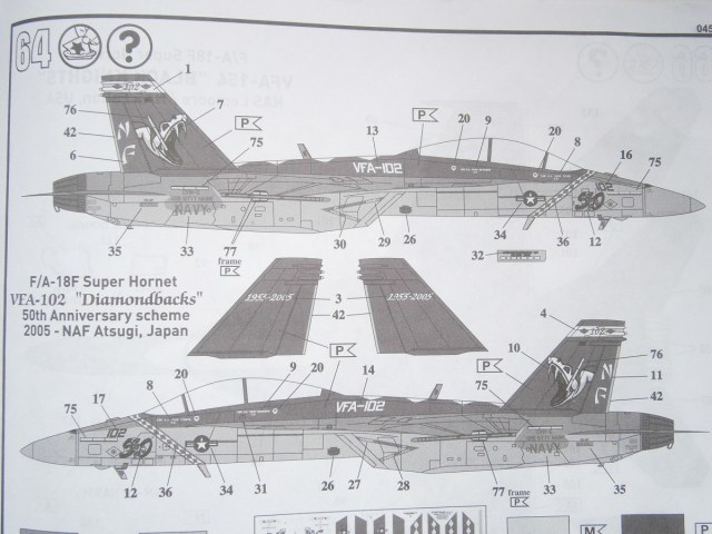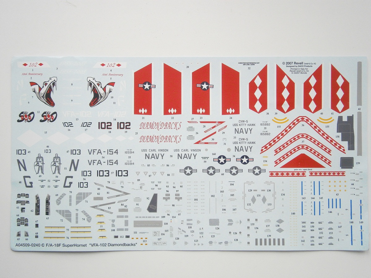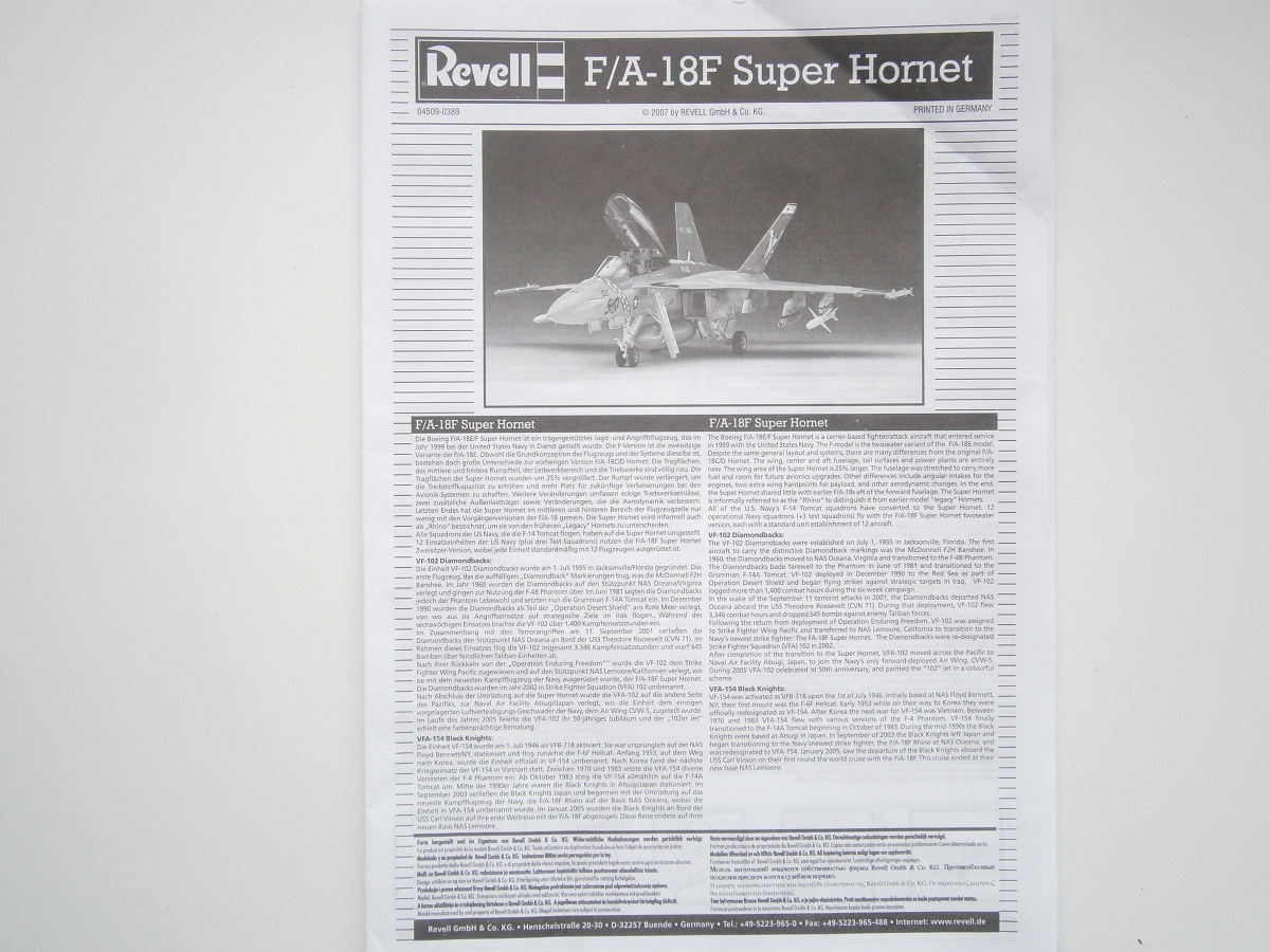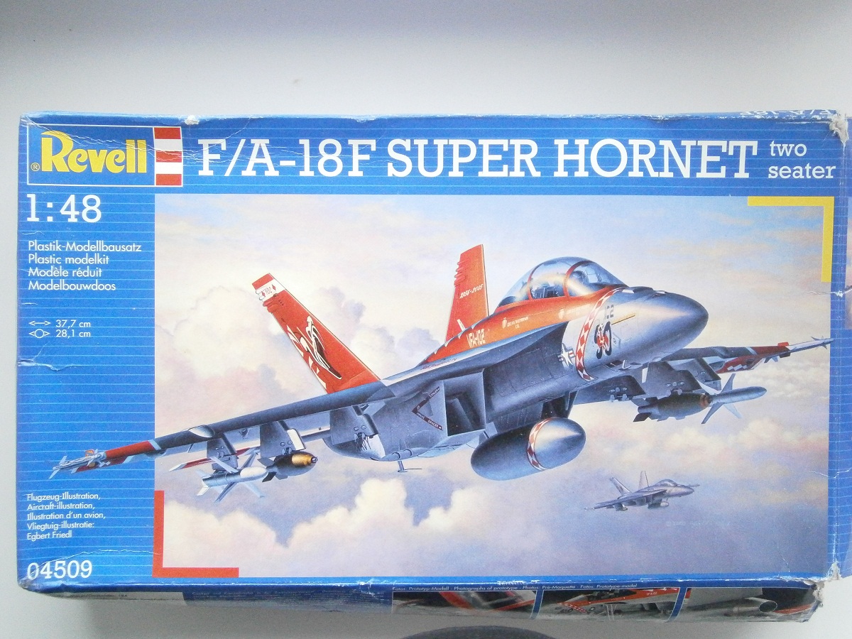 Приветствую Всех и доброго времени суток уважаемые коллеги по цеху !!! Предлагаю Вашему вниманию обзор американского многоцелевого палубного истребителя F/A-18 F SUPER HORNET , от всем знакомого производителя REVELL, представленную в 1/48-м масштабе. В красочной картонной каробке, упакованные в полиэтиленовые пакеты находится десять литников с деталями светло-серого цвета, и один литник из прозрачного пластика, это остекление фонаря кабины пилотов. Инструкция хорошего качества, выполнена на белых листах в форме книжки, читается хорошо и информация доступна и понятна. Также в инструкции представлено два варианта окраски и выполнения модели самолета .:1) VFA -102 " Diamondbacks " 50 th Anniversary scheme 2005- NAF Atsugi, Japan. 2) VFA-145 " BLACK KNIGHTS " NAS Lemoore/ NAS Fallon, USA. Деколь представлена на большом листе, также на два варианта. Теперь хочется вернутся к деталям из набора: детали фюзеляжа имеют хороший тоненький не глубокий крой, кое где нужно будет поправить скрайбером, имеются заклепочные швы, что очень порадовало, и не много эксплуатационных лючков. Консоли крыла имеют также хорошею детализацию в виде лючков, и заклепочных швов. Кабина пилотов выполнена не плохо, приборная доска мне в принципе понравилась, хорошо выделены МФИ и приборы. Кресла пилотов конечно лучше заменить на смоляные. Ниши шасси хорошо детализированы имеется хорошая проводка гидравлики и топливопровода . Стоики шасси очень порадовали, хорошо детализированы , даже имеется проводка гидравлики. Колеса шасси в хорошем исполнении, выполнены в продавленном стояночном положении, я их оставлю. Сопла двигателя слабоваты, их можно сразу менять на что нибудь стоящее , ну допустим от AIRES они предлагают хороший детализированный набор . Кили также порадовали , имеют хороший крой, и заклепочные швы, и выделенные ОГНИ ПОЛЕТА СТРОЕМ. Ну вот вроде и все что хотелось рассказать о данном наборе , в целом набор мне понравился. Желаю Всем удачи !!! С Уважением Дмитрий !!!