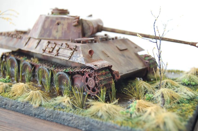 Сделано хорошо! мне понравилось! и танк так вполне может заржаветь! потому как находится видимо у воды а если вода то воздух влажный, там видимо где он стоит это болотистая местность, от себя хотел бы дабавить что было бы очень эффектно если переместить его в дремучий лес! добавить гнилых поваленых деревьев, и поросшие мхом деревья! ну эт только моё мнение! а Работа повторюсь , класс! даже хотелось бы поучиться некоторым приёмам, в частности трава и местность из чего и как сделана))