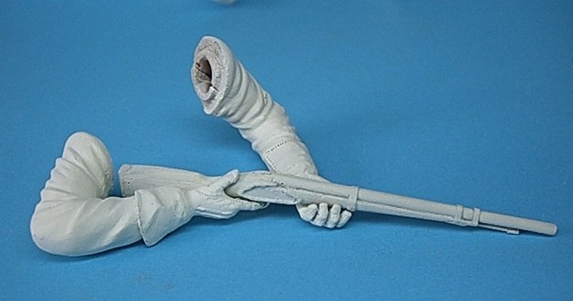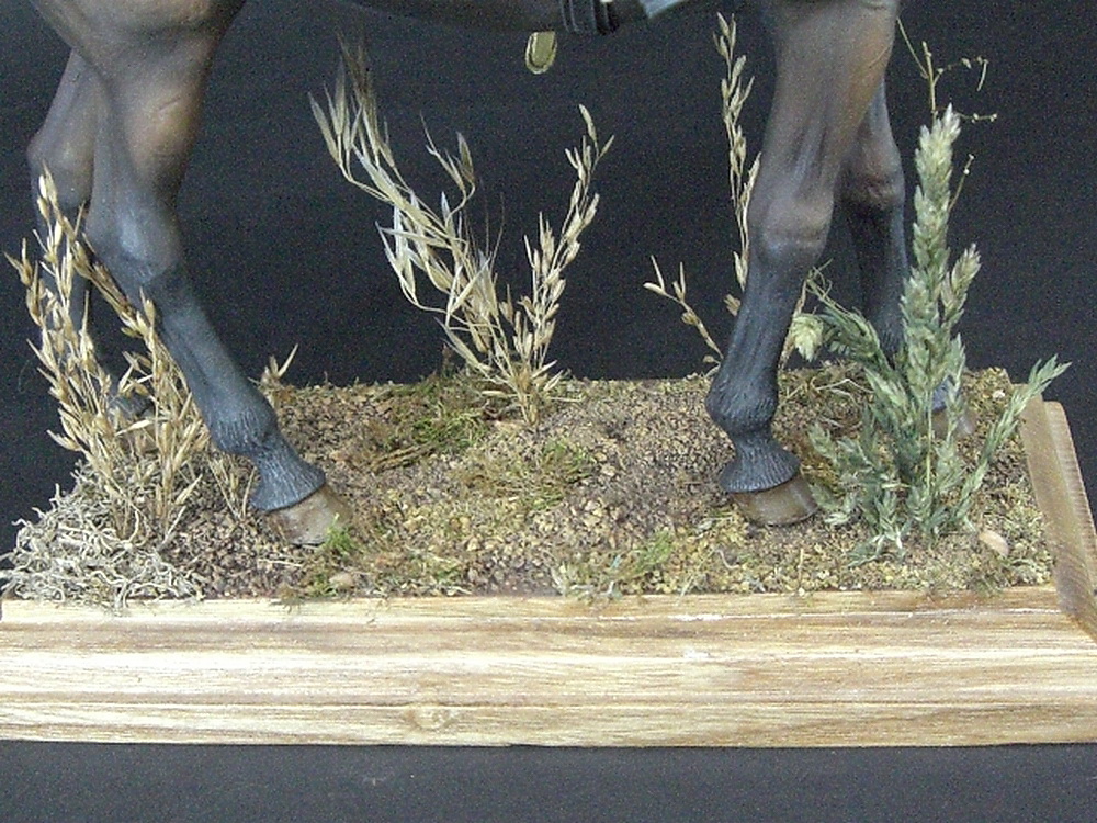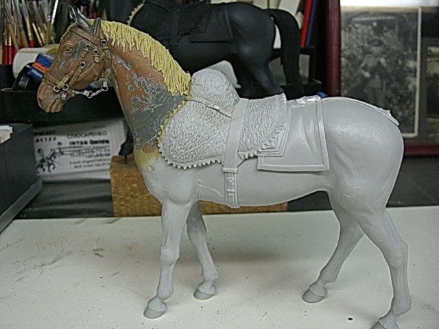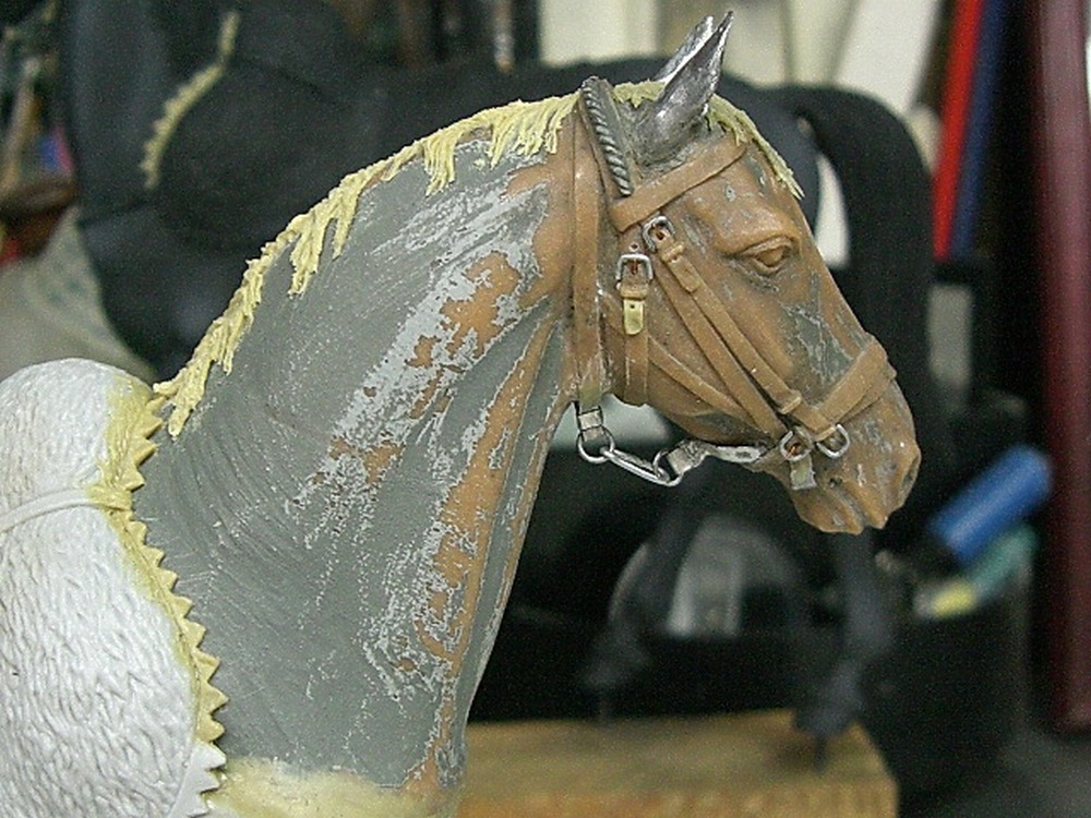 Прорезка и долепка новой головы для лошади.Подгонка рук к оружию,обхват кистями рук ружья,изменить мимику лица -целится одним глазом,второй закрыт и приподнята щека,прорезка структуры дерева на цевье и прикладе реужья,доработана казённая часть ружья,вылеплена грива на шлеме(родная пластиковая ужасна),прорезка амуниции ,одежды , подгонка седла и всей упряжи,вылеплена грива и хвост лошади,художественная роспись и конечно же профессиональная подставка .