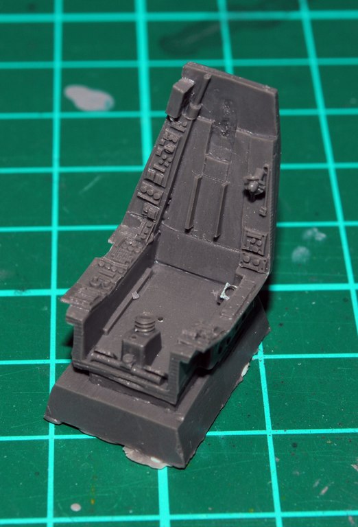 Кабина хорошего качества, кресло очень похоже на прототип, приборка не совсем. Имеется боковая приборная панель и внутренняя сторона двери. К сожалению, потолок не подходит к старому набору Звезды - не совпадает расположение верхнего окна.