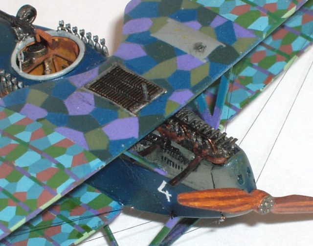 КРЫЛЬЯ и ХВОСТОВОЕ ОПЕРЕНЬЕ имели грубую и неправильную имитацию провиса, и очень большую толщину. Обработаны до, более-менее, реального вида. Элероны отделены, нарощены и «посажены» на медные штифты с целью придания потом отклонения . На центроплане снизу добавлены имитация низа бака и сетки радиатора (от чайного пакетика) Вклеены талрепы из медной проволоки. В этот раз решил стелать их более длинными (раньше вклеивал по самые колечки).